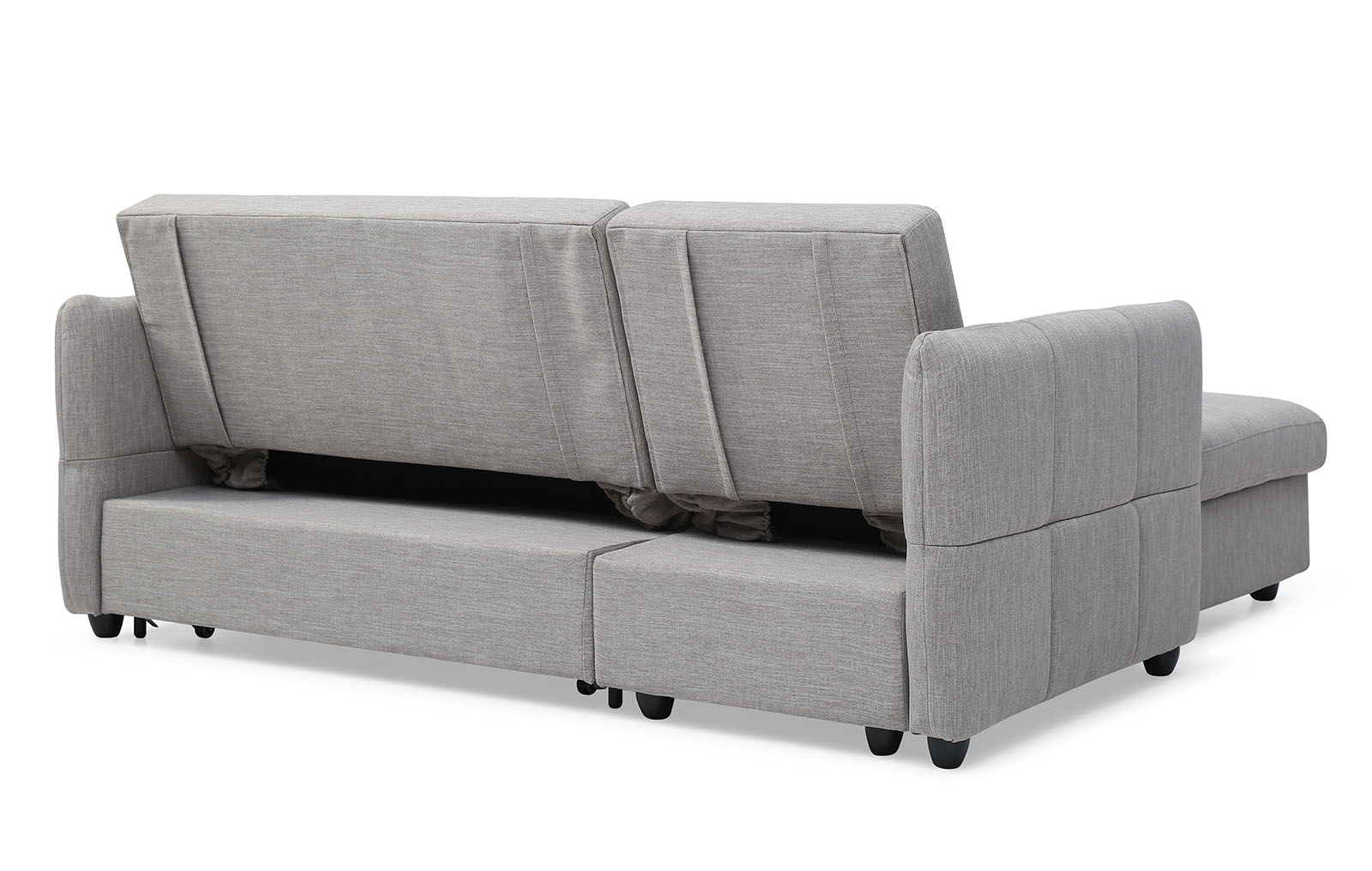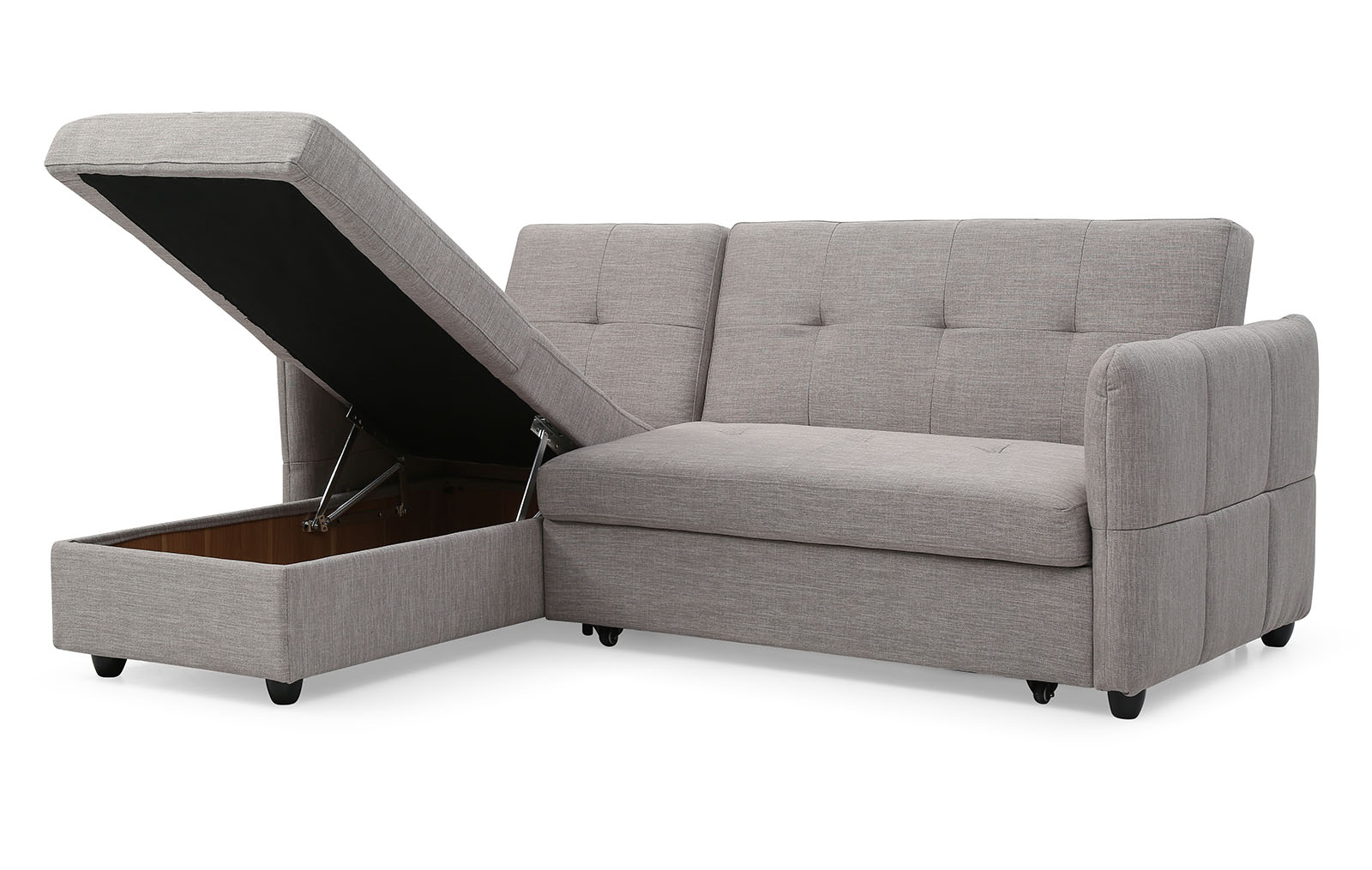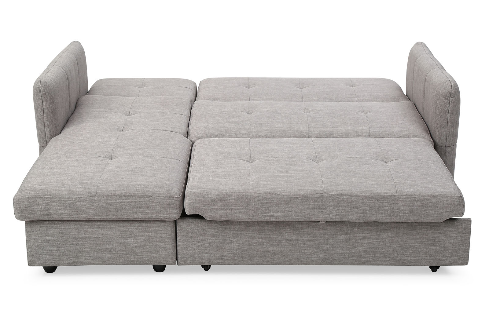Раскладывается эта модель в просторную двуспальную кровать со спальным местом 180*180 см, под боковой секцией есть специальный ящик, в котором можно хранить различные вещи.