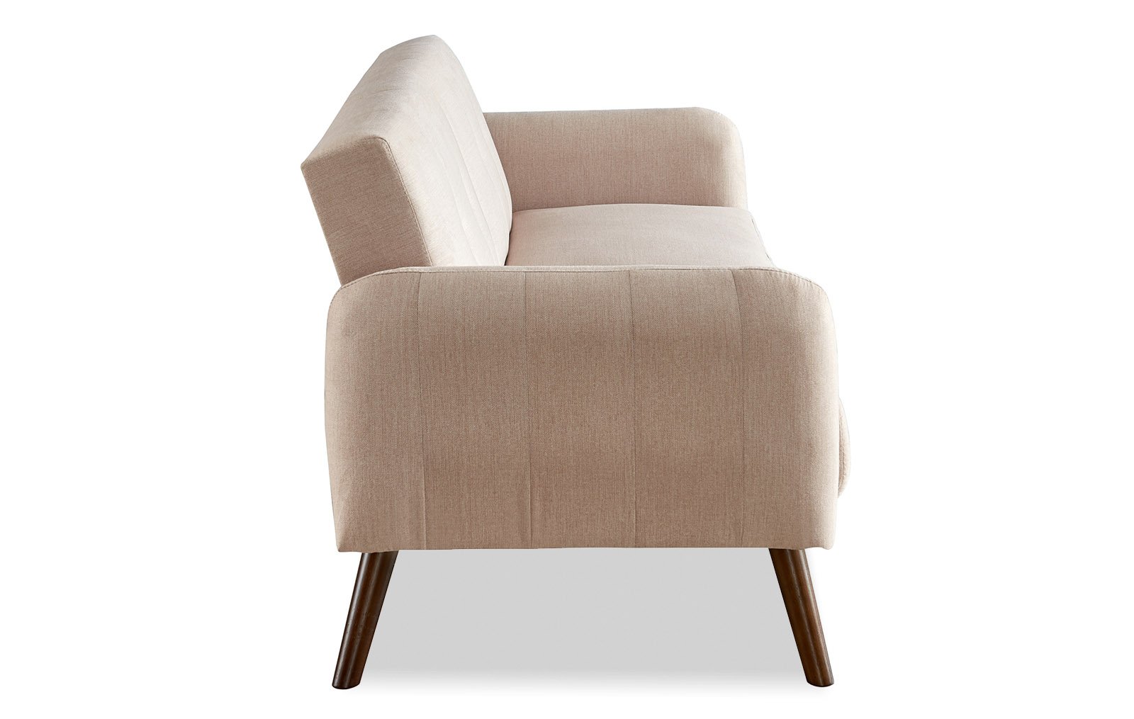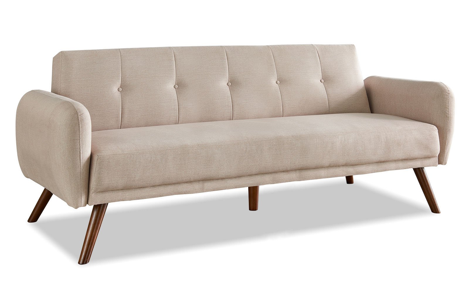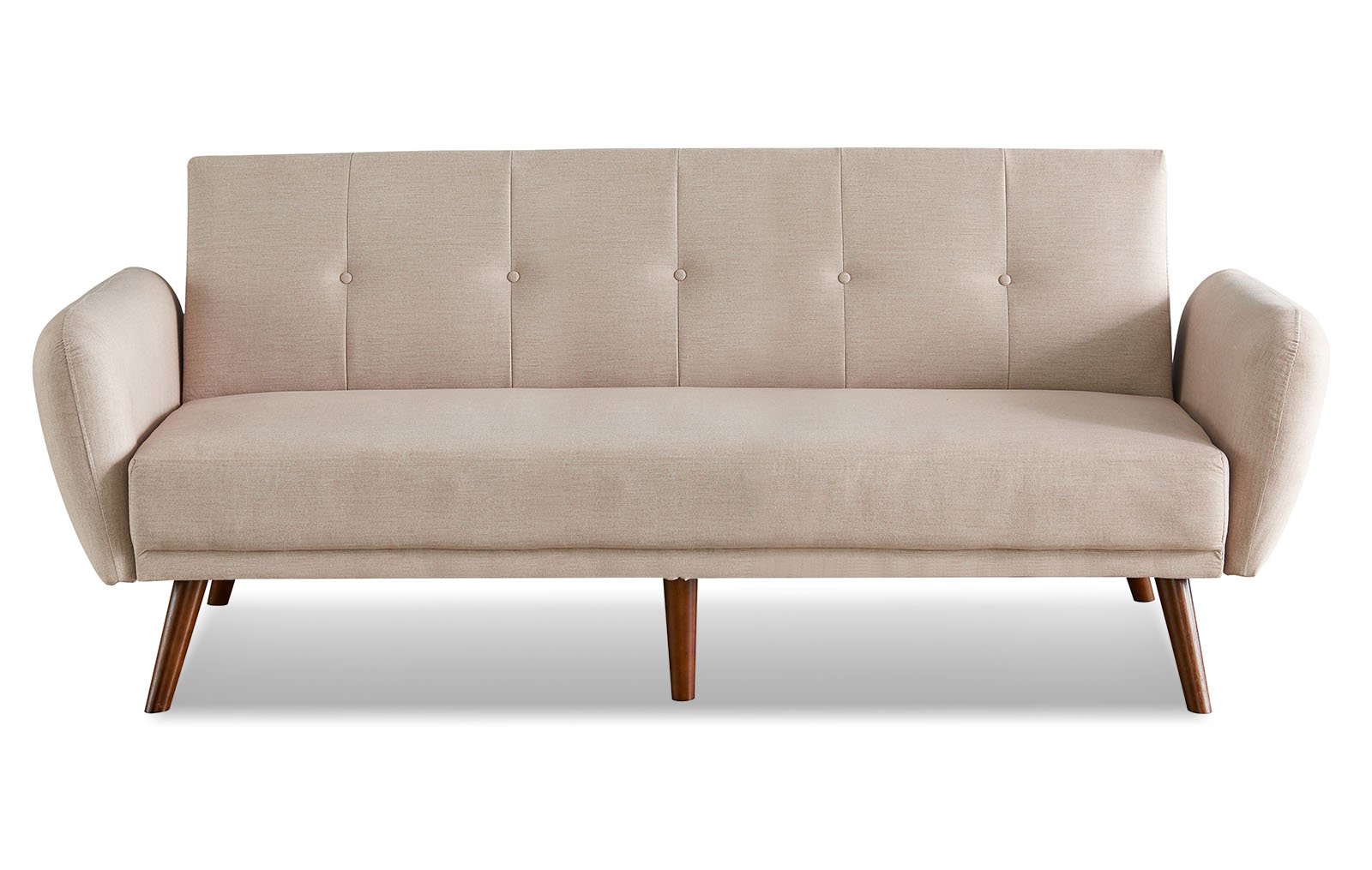Современная модель дивана с отсылкой к модерну 60-х - диван-кровать бежевого цвета с высокими ножками из темного дерева.