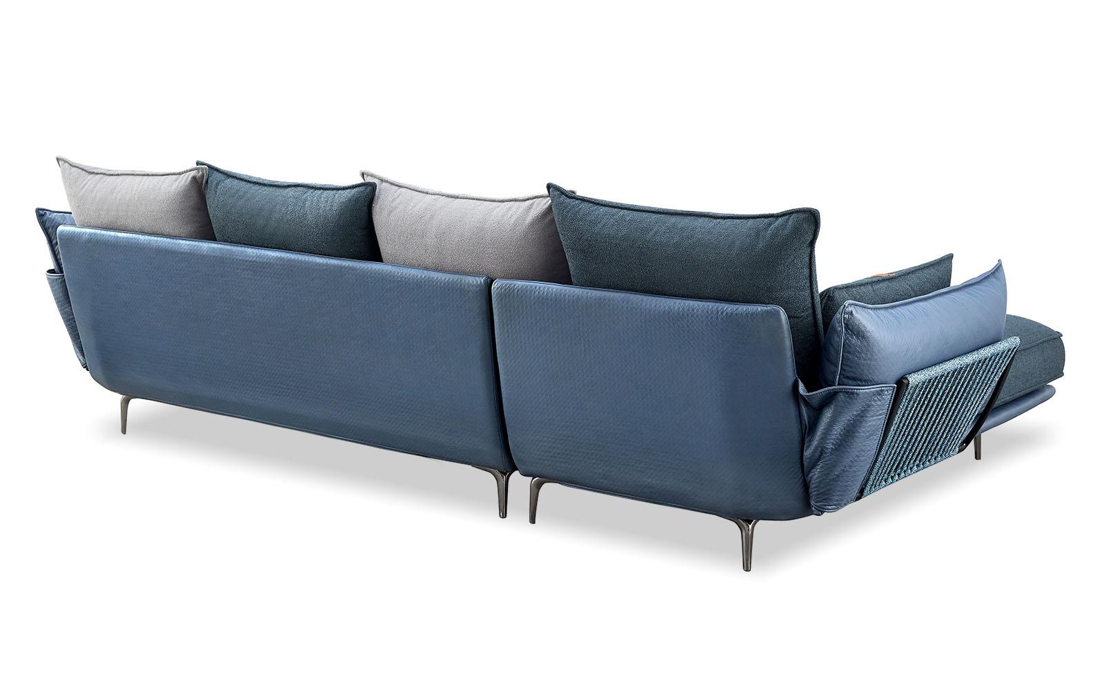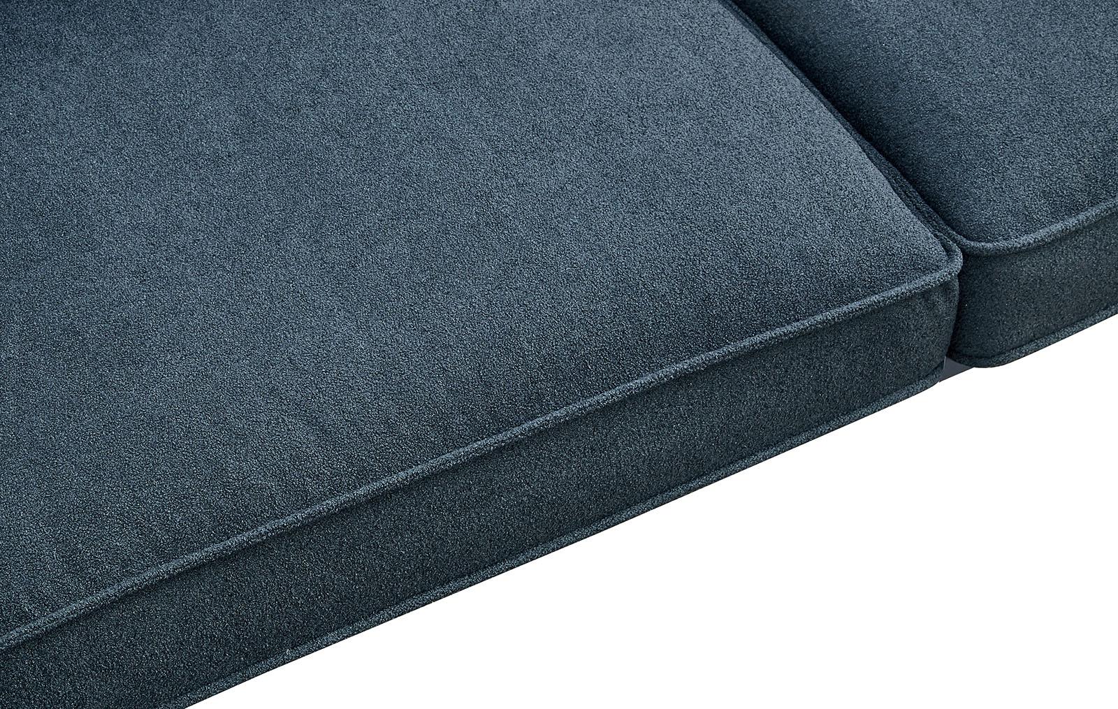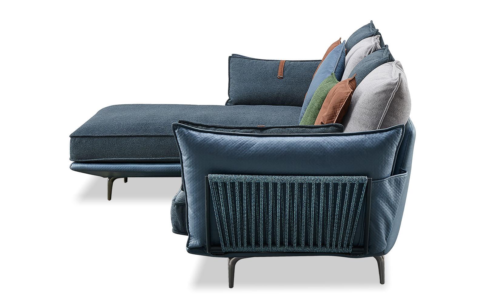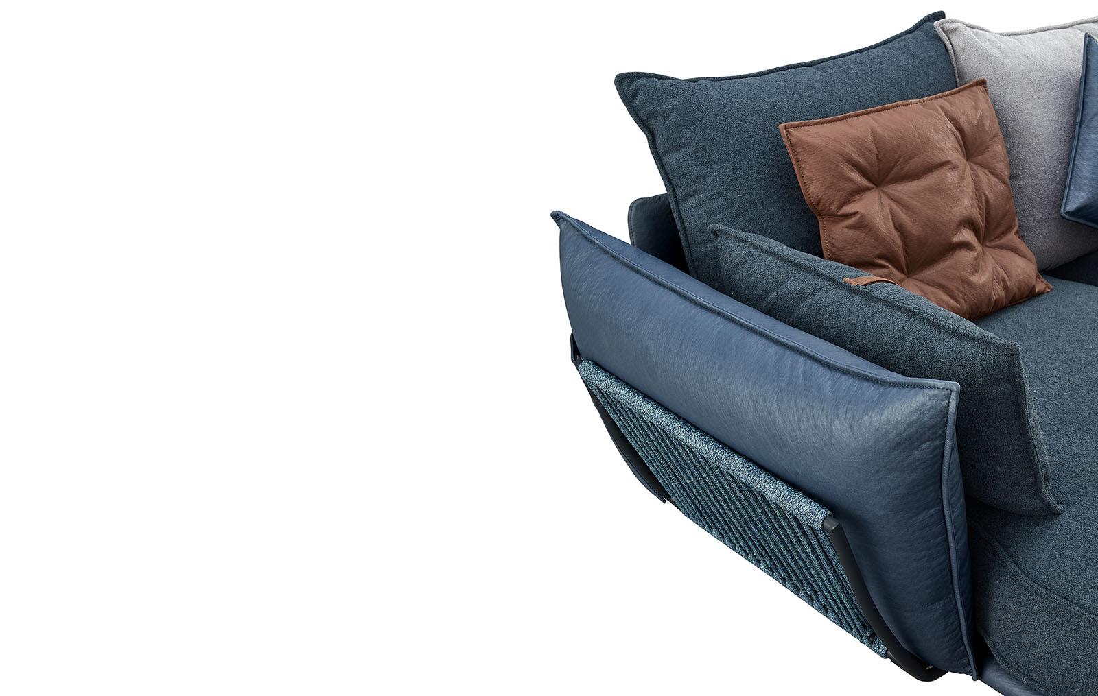 Обивка: экокожа Leathaire синего цвета (низ), ткань Teddy серо-синего цвета (сиденье и подушки), ткань Teddy светло-серого цвета (подушки), ткань Teddy зеленого цвета (подушка), ткань коричневого цвета (подушки)