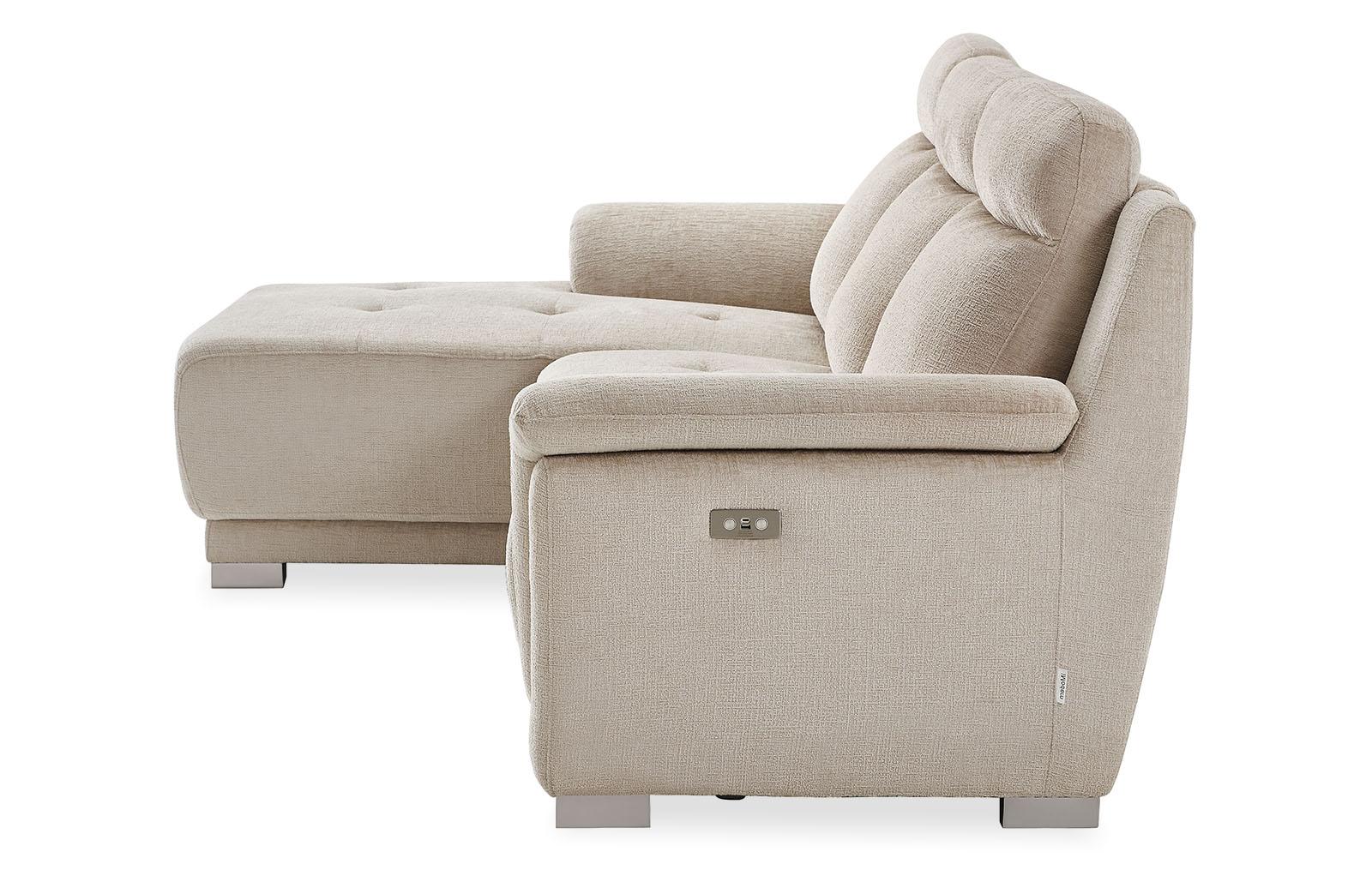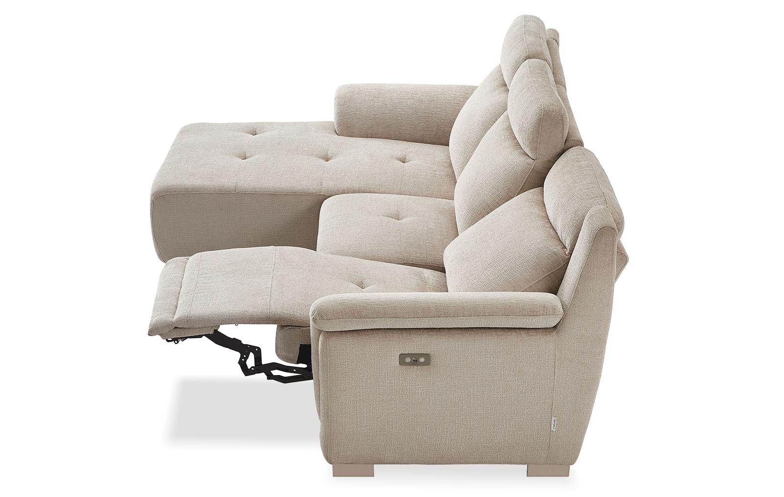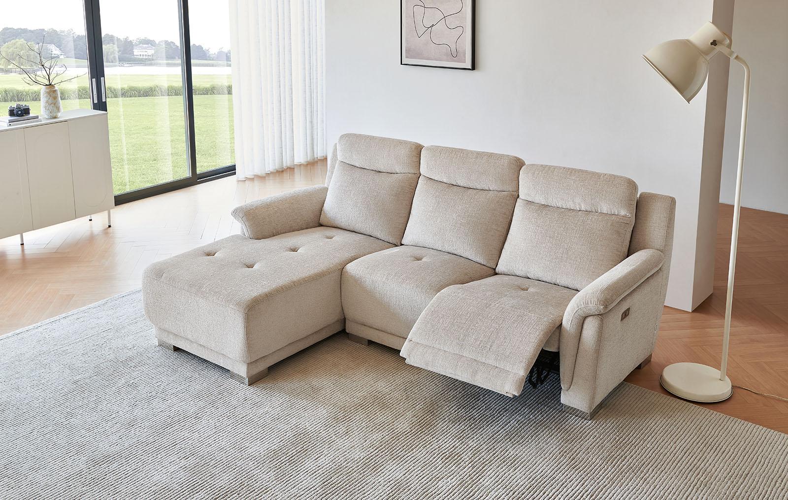 Модуль-реклайнер позволяет опустить спинку и приподнять нижнюю часть дивана в качестве подставки для ног для большего комфорта. Диван оснащен электроприводом. Управление с помощью кнопок на подлокотнике.