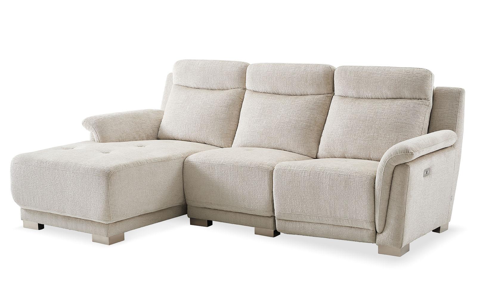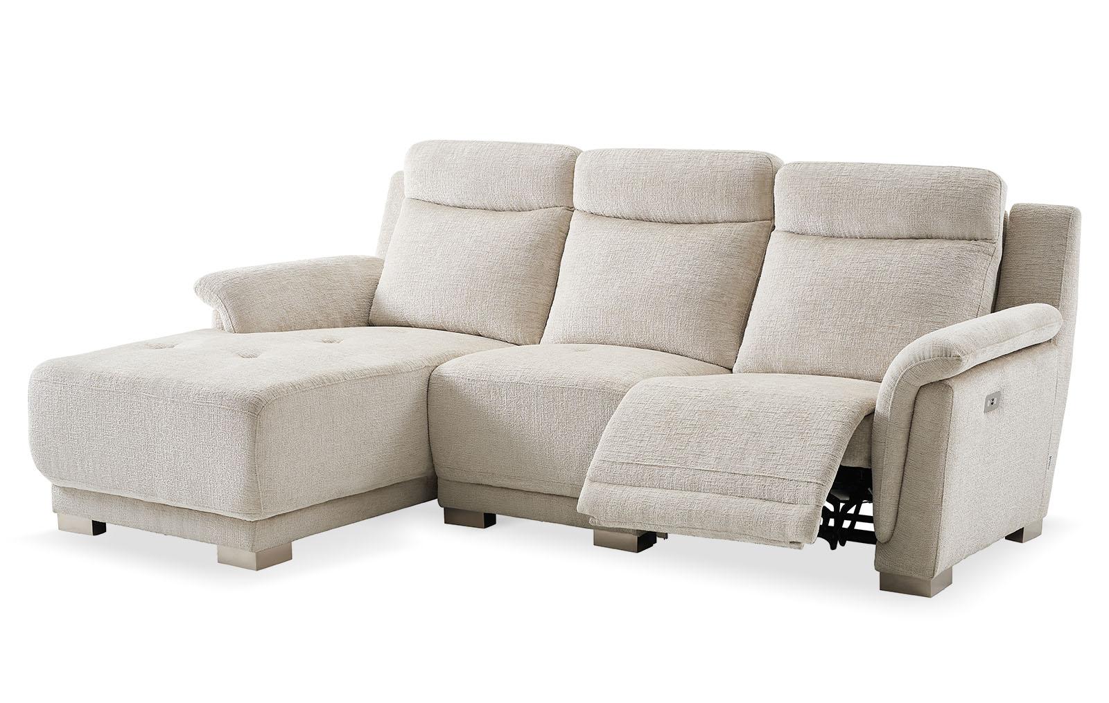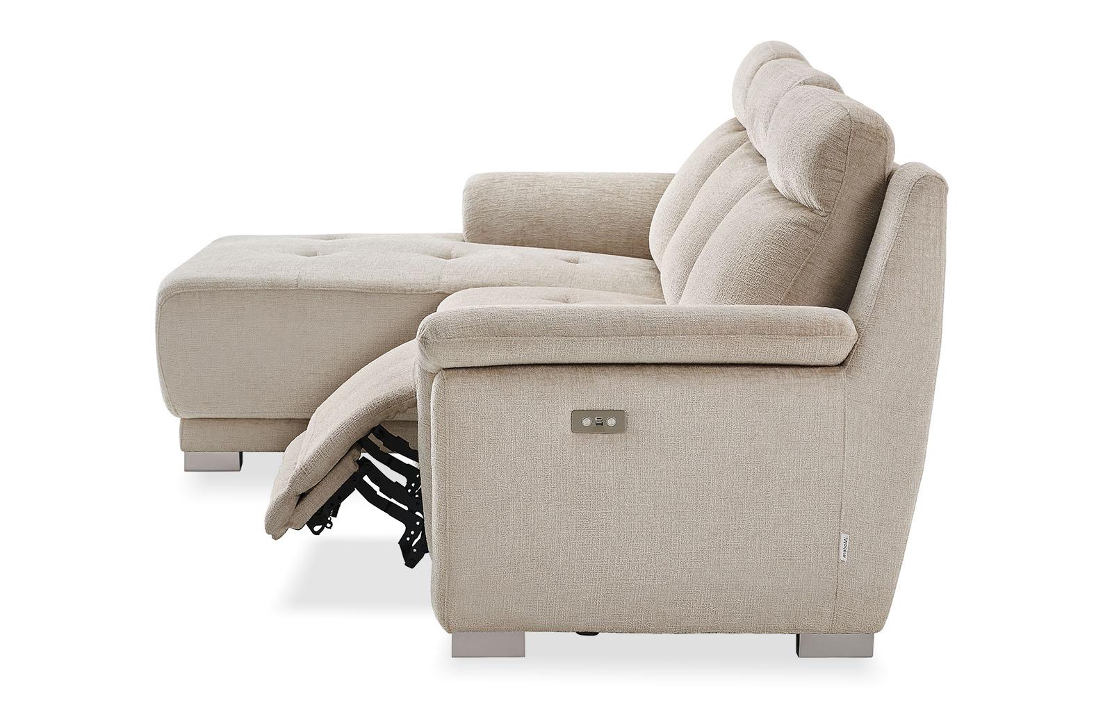 Модуль-реклайнер позволяет опустить спинку и приподнять нижнюю часть дивана в качестве подставки для ног для большего комфорта. Диван оснащен электроприводом. Управление с помощью кнопок на подлокотнике.