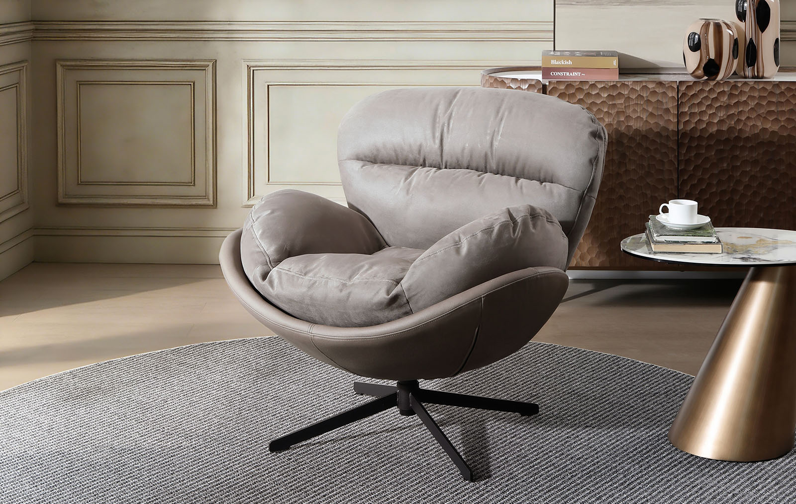 Поворотное металлическое основание с функцией вращения на 360° обеспечивает свободу движения и удобство, позволяя легко менять положение, не вставая с кресла.Кресло станет гармоничным дополнением в гостиной, спальне, зоне отдыха или кабинете, добавляя интерьеру ощущение спокойствия и уюта.