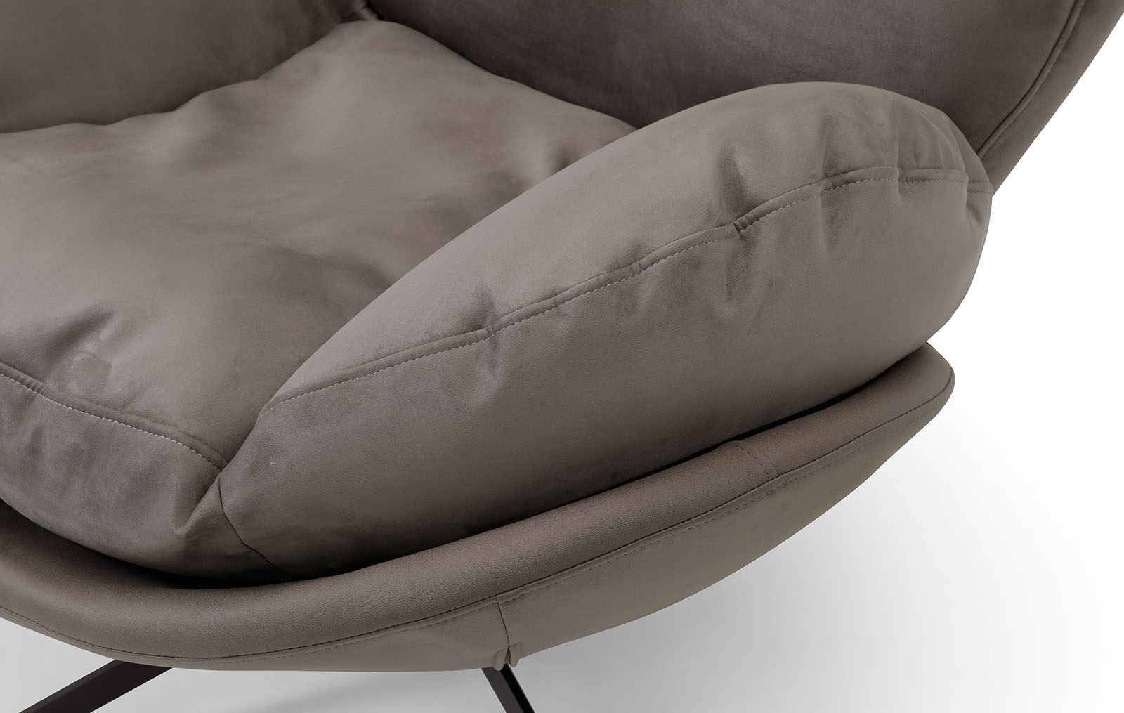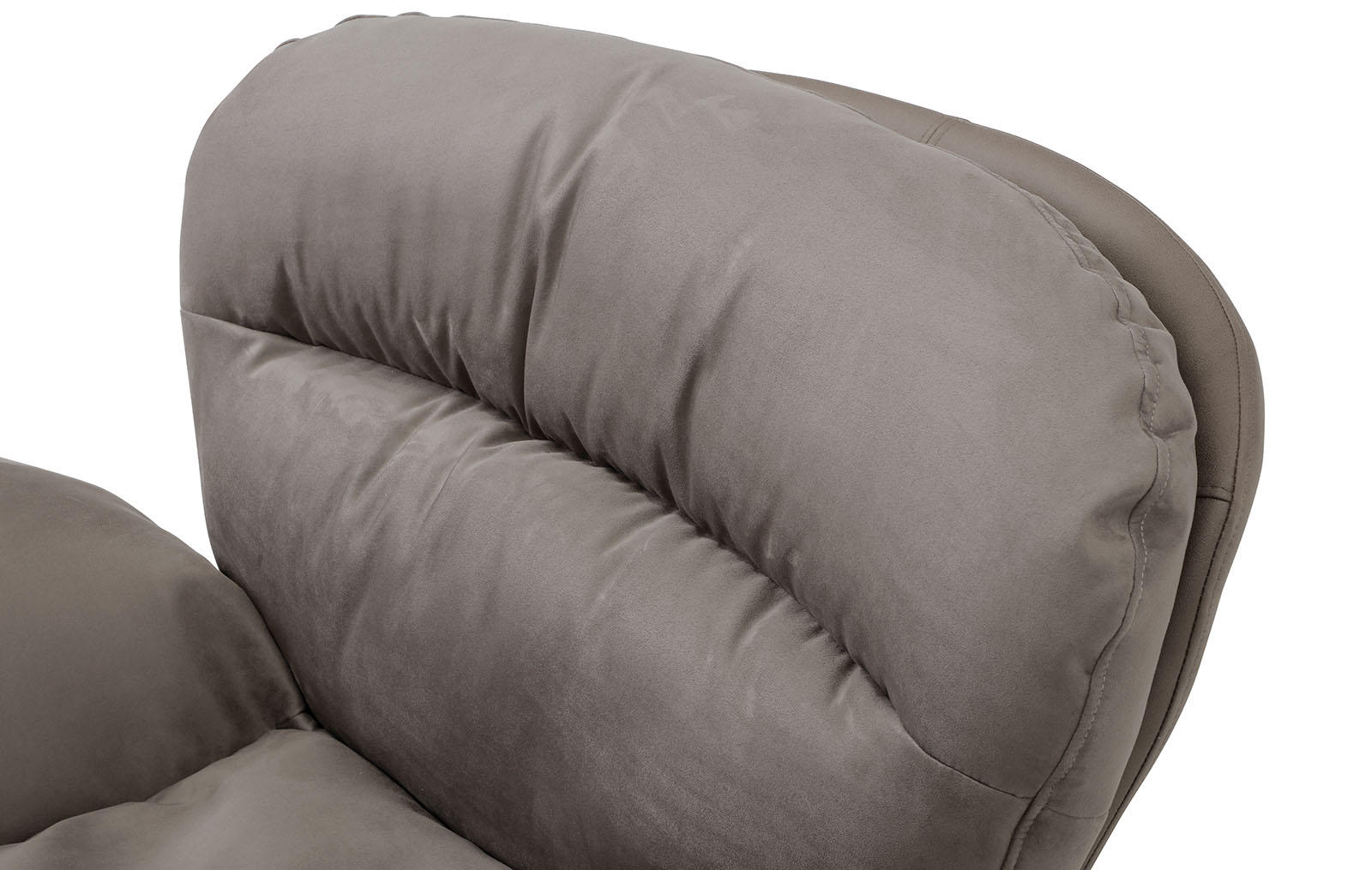 Обивка выполнена из экологической замши серо-коричневого оттенка. Ткань приятна на ощупь, обладает красивой фактурой и подчёркивает изысканный характер модели. Закруглённый корпус обит серым нубуком в тон и отсылает к стилю Mid Century Modern.