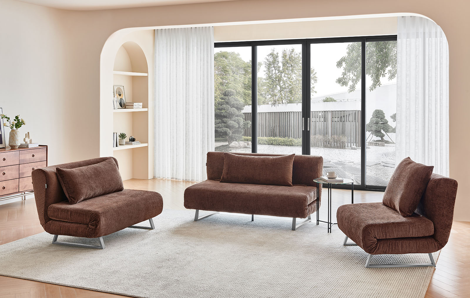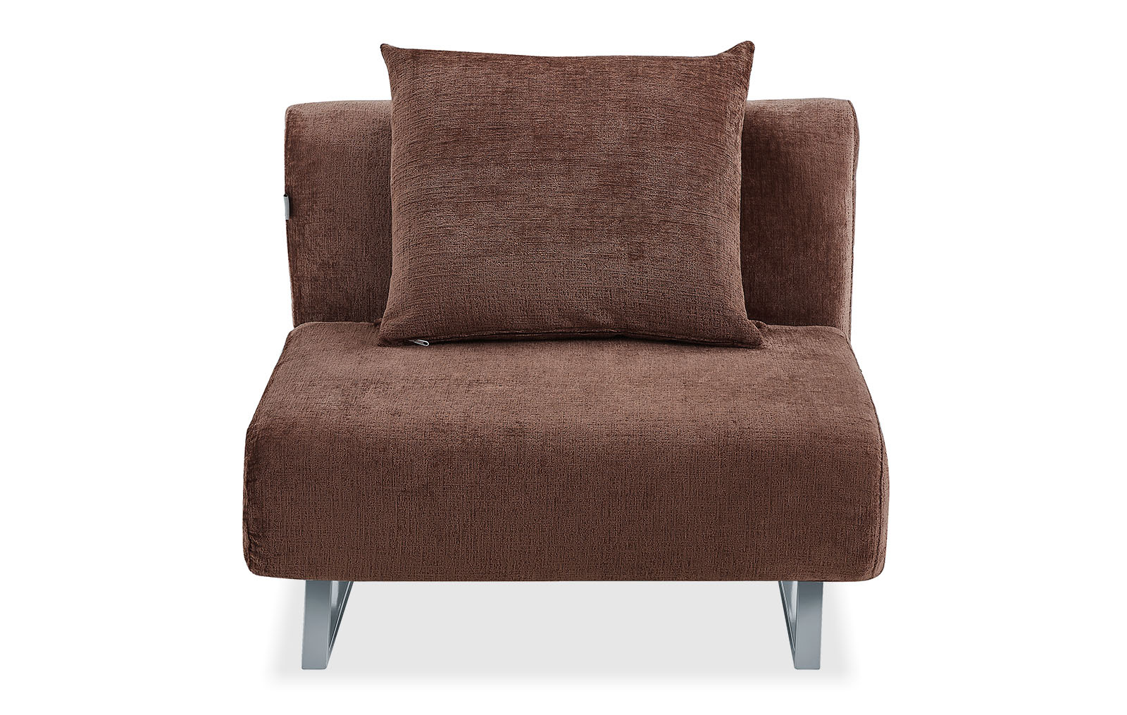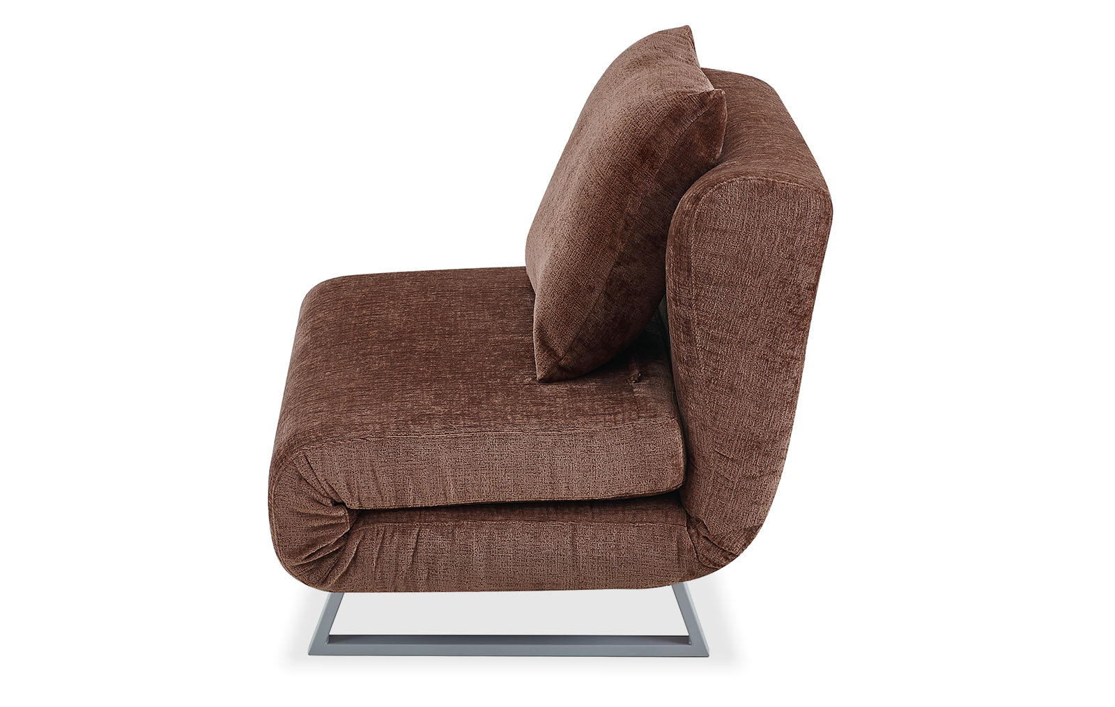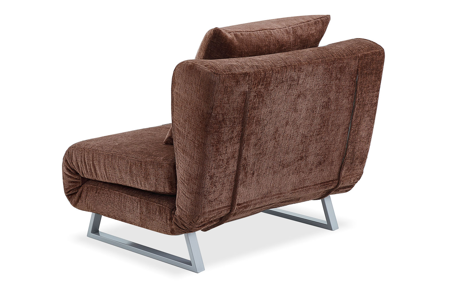 Кресло-кровать Rosy (Рози) коричневого цвета. Модель привлекает внимание плавностью линий, минималистичностью и функциональностью. Для превращения кресла в спальное место используется комбинированный механизм - трехуровневый трансформер. Дополнительную устойчивость обеспечивают выдвижные опоры из металла.