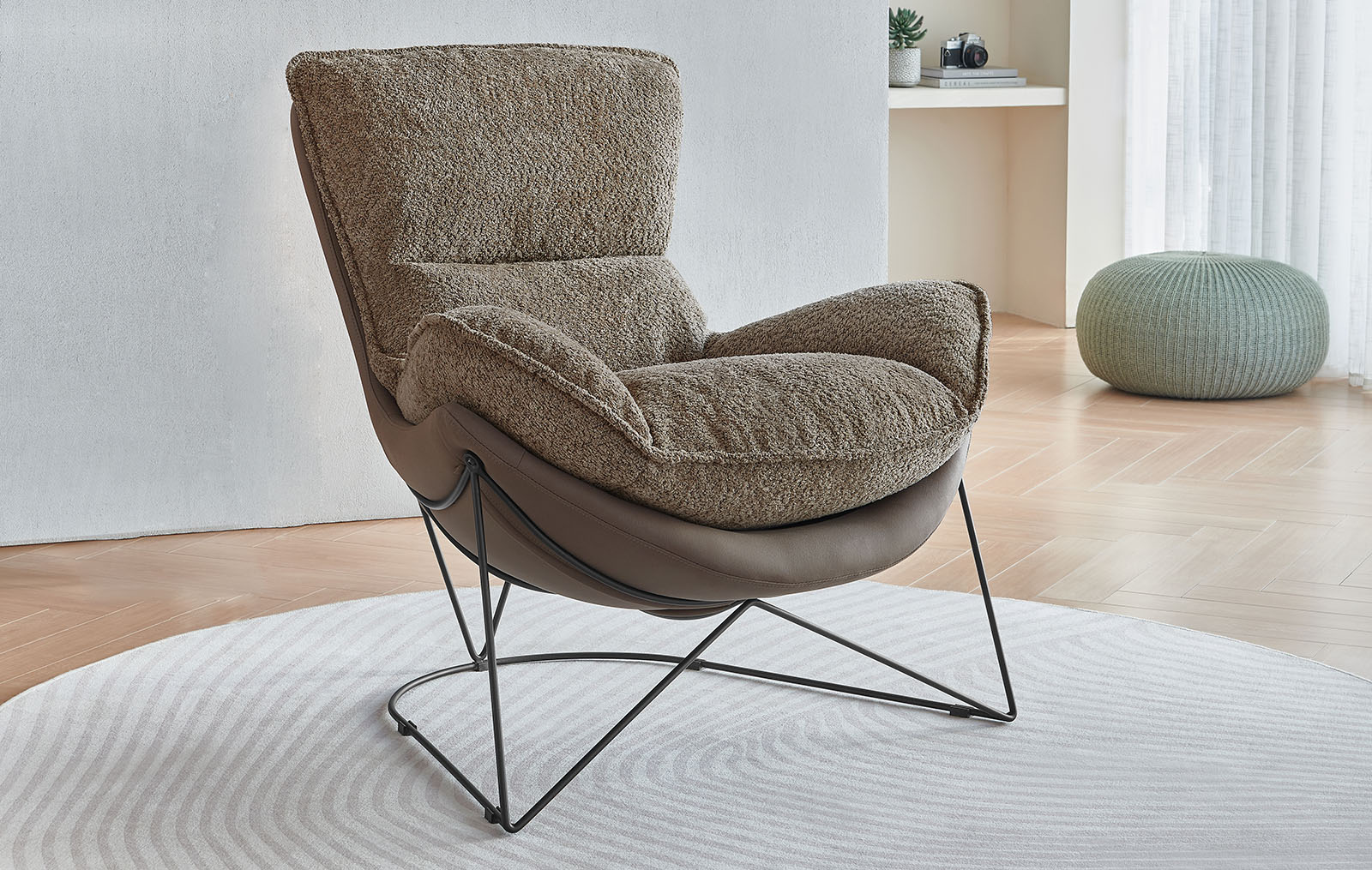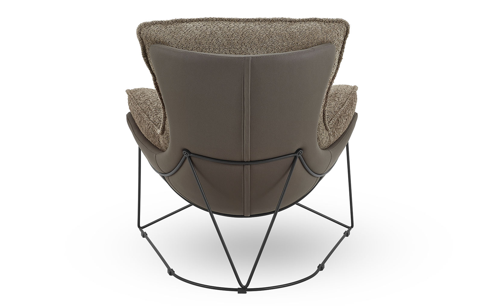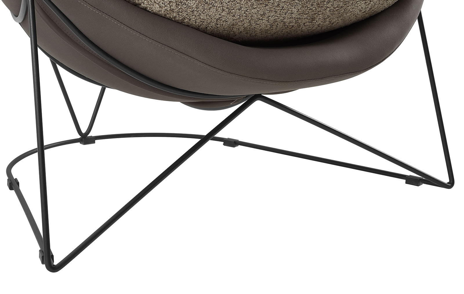 Оригинальная ножка кресла выполнена в виде металлического каркаса из прутьев, что придает ему современный и легкий вид, визуально освобождая пространство.