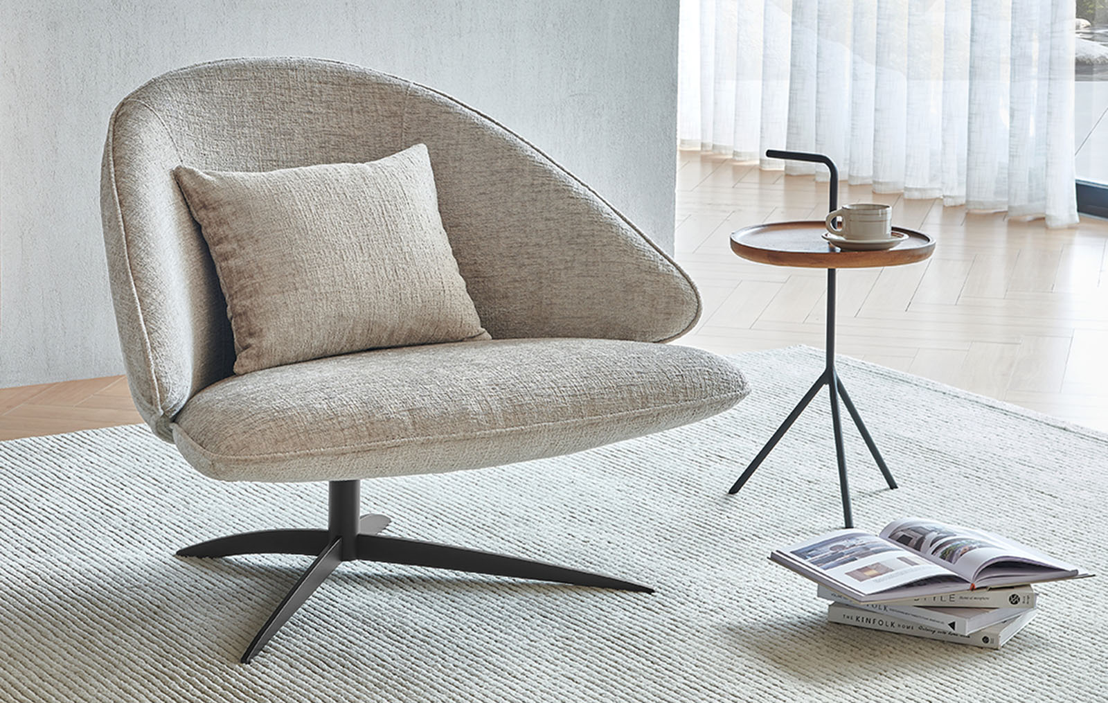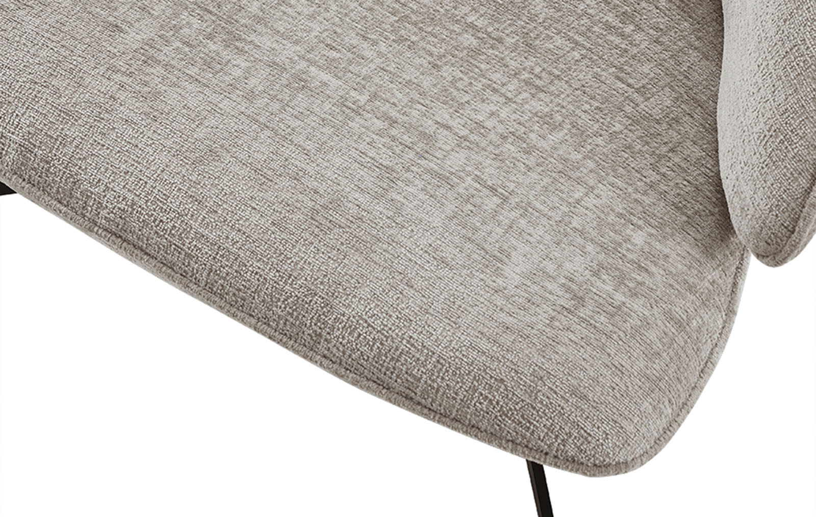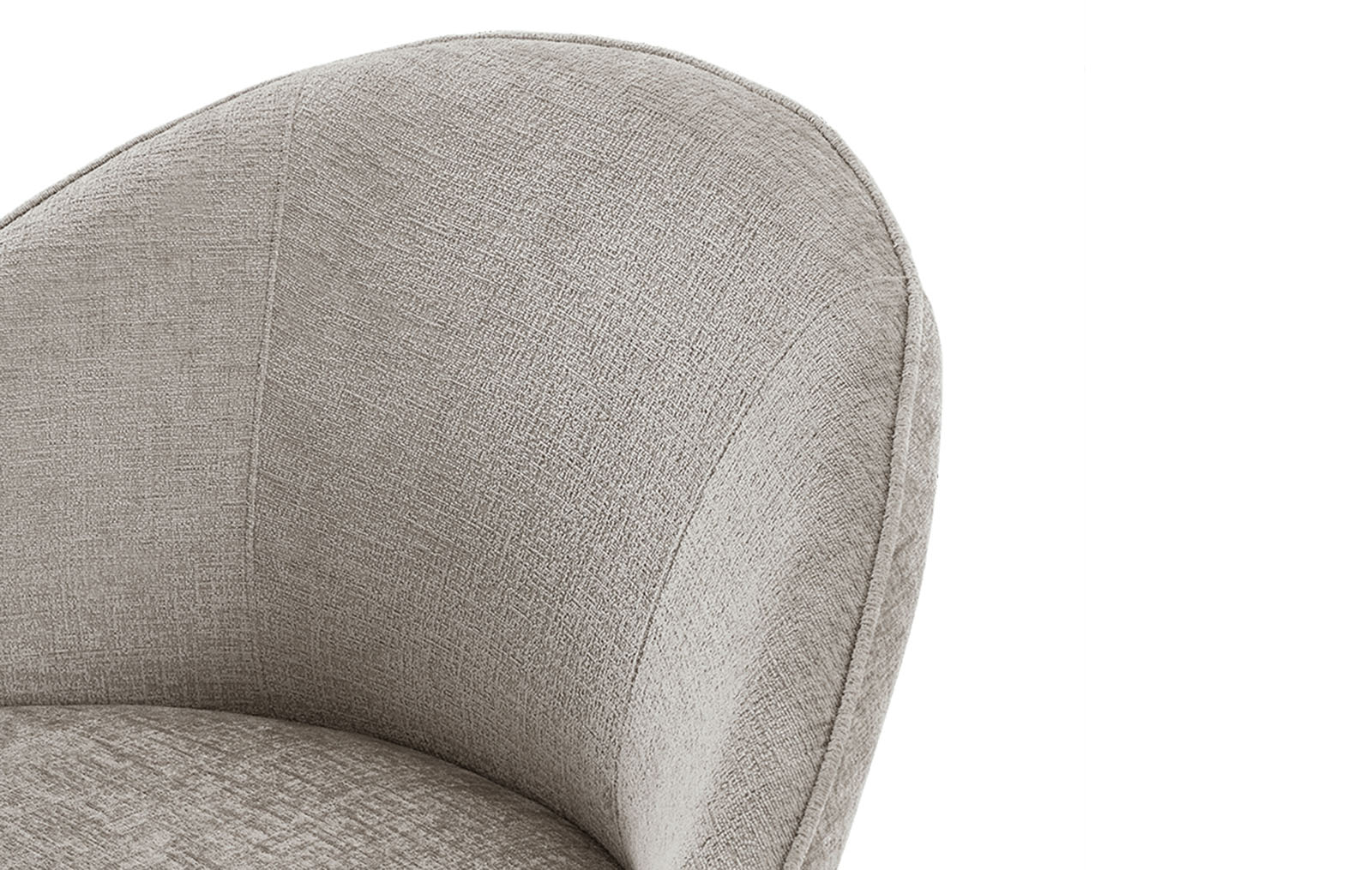 Универсальный серо-бежевый оттенок обивки впишется в различные цветовые схемы гостиных и лаунж зон. Ножка на крестообразном основании - из черного металла.