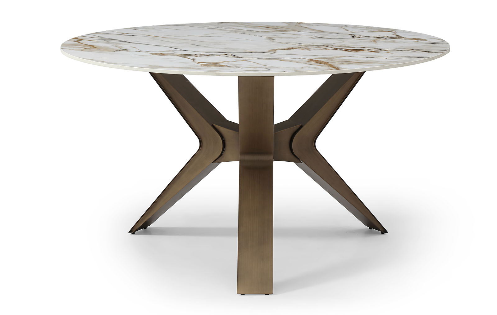 Столешница диаметром 140 см изготовлена из глянцевой керамики толщиной 12 мм. Ножка сделана из металла в бронзовом оттенке.