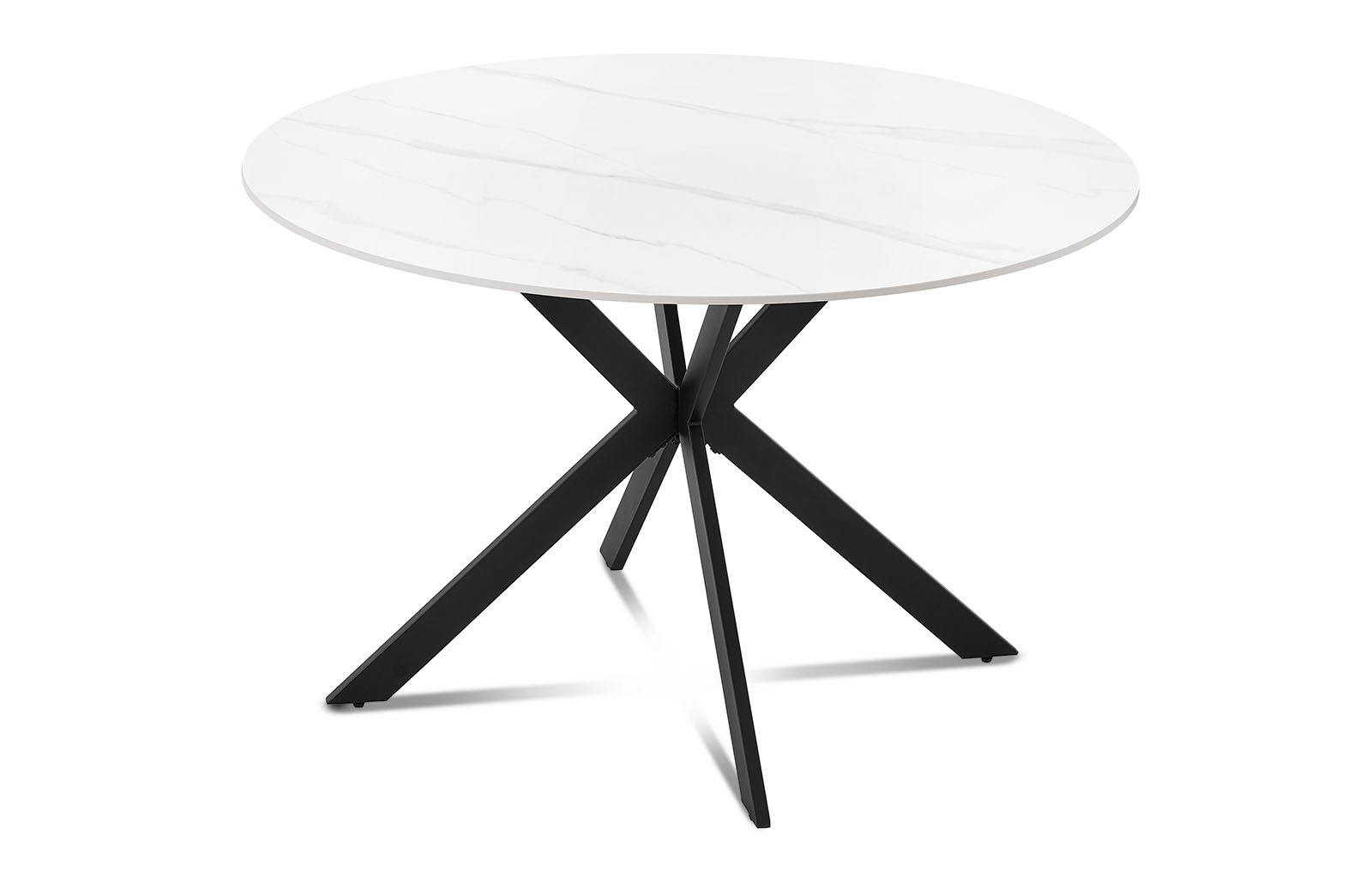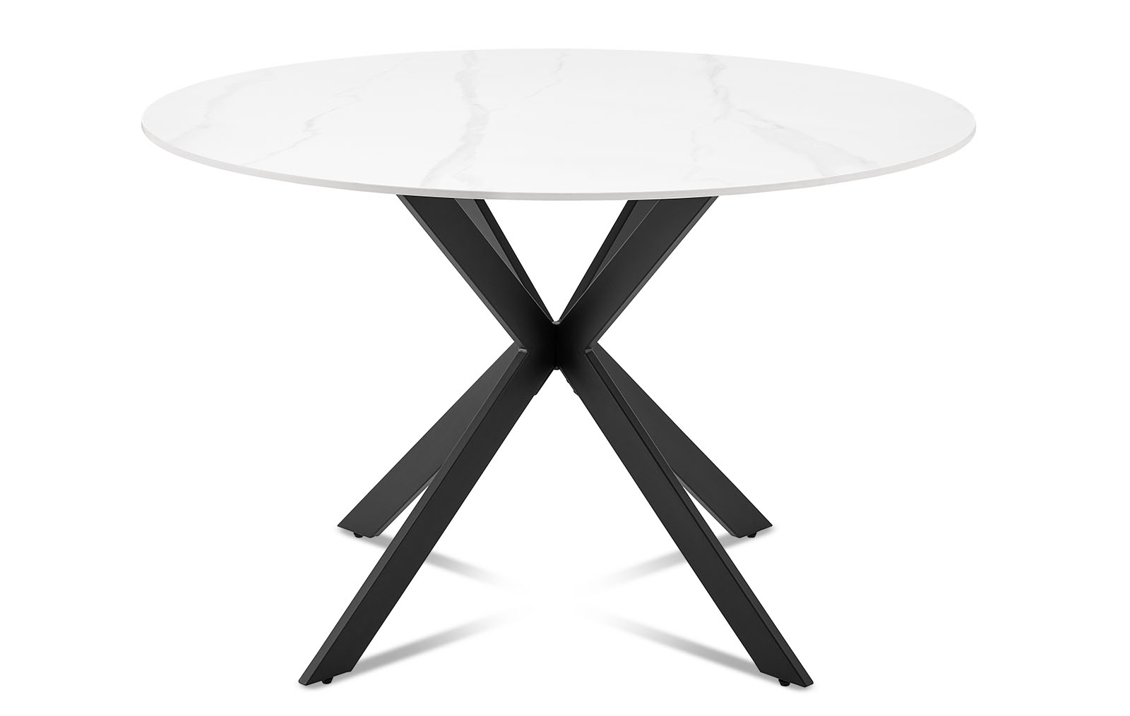 Круглая столешница изготовлена из глянцевой белой керамики с серыми узорами под мрамор толщиной 11 мм, диаметр 120 см. Под столешницей находится соединительная часть из MDF толщиной 18 мм. Подстолье сделано из металла.