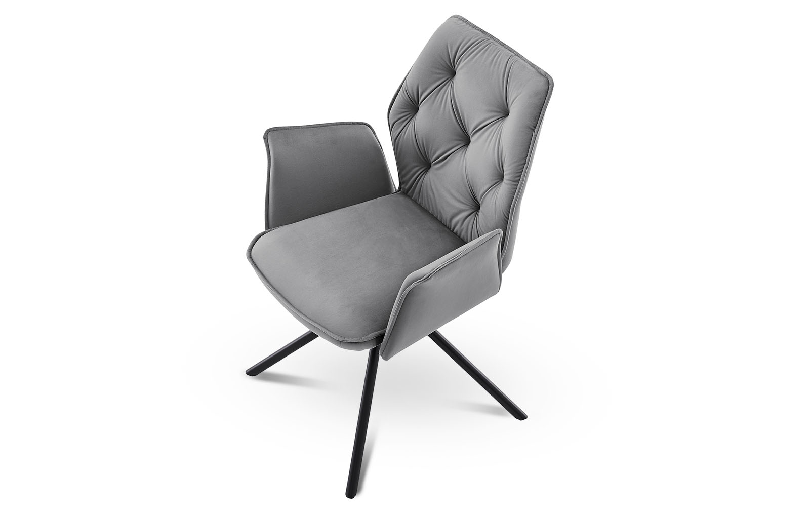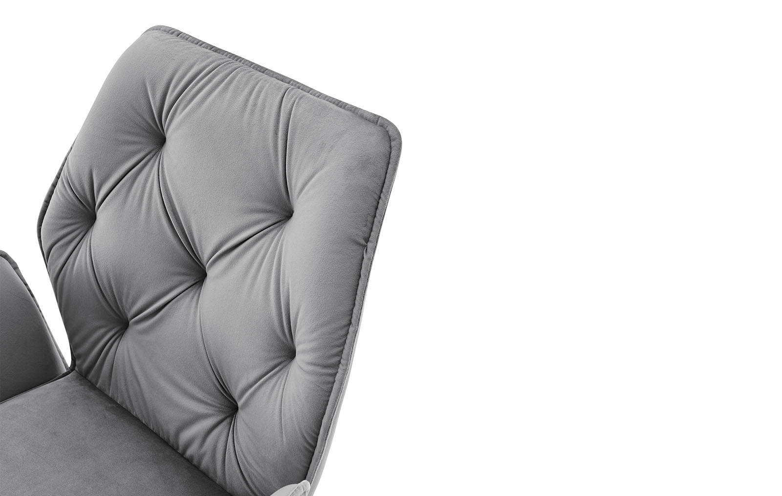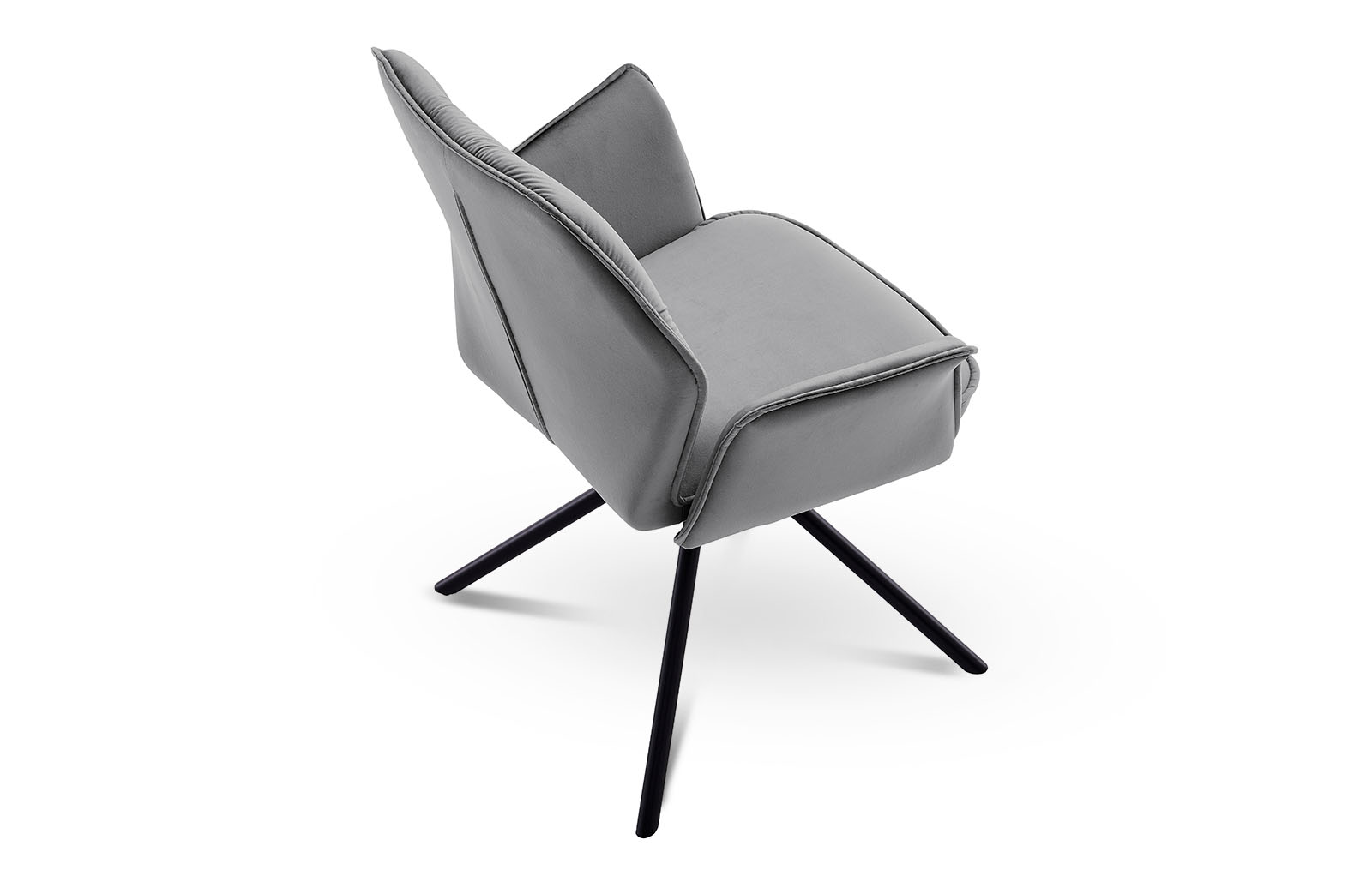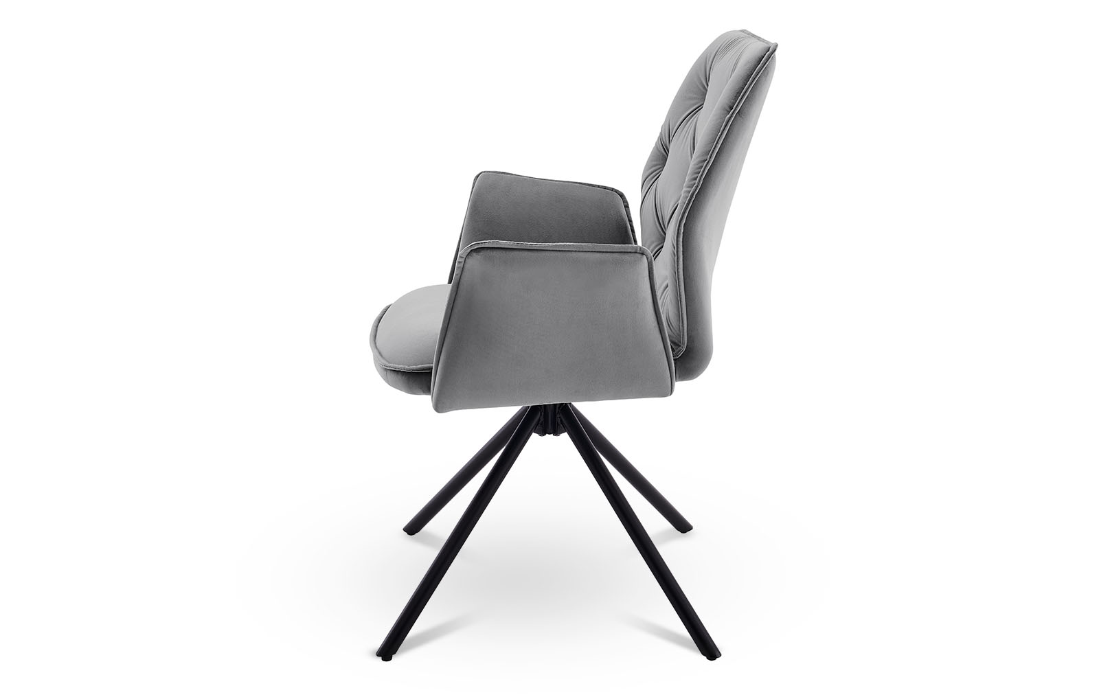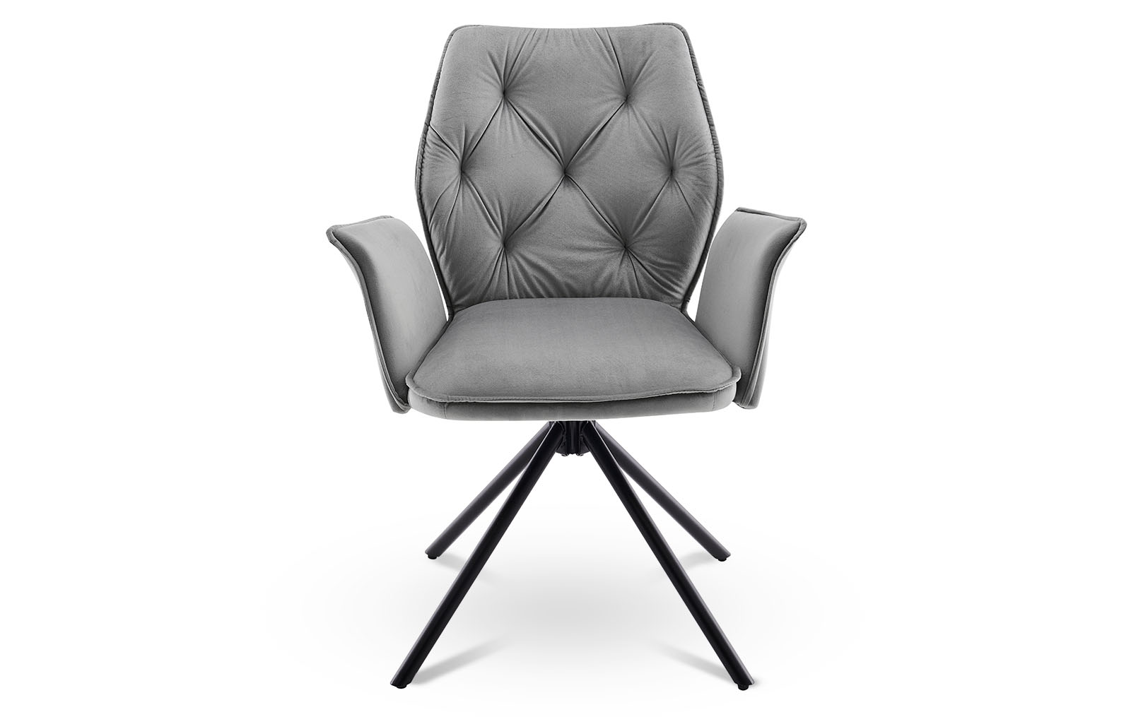Стул Estella имеет поворотный механизм, может вращаться на 180°. Его обивка из приятного на ощупь велюра универсального серого цвета. Ножки из металла с защитным напылением. Данная модель имеет спинку, на которую можно с комфортом облокотиться, и удобные подлокотники.