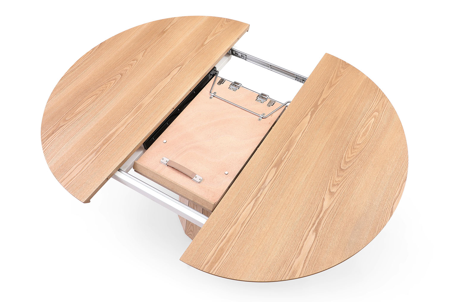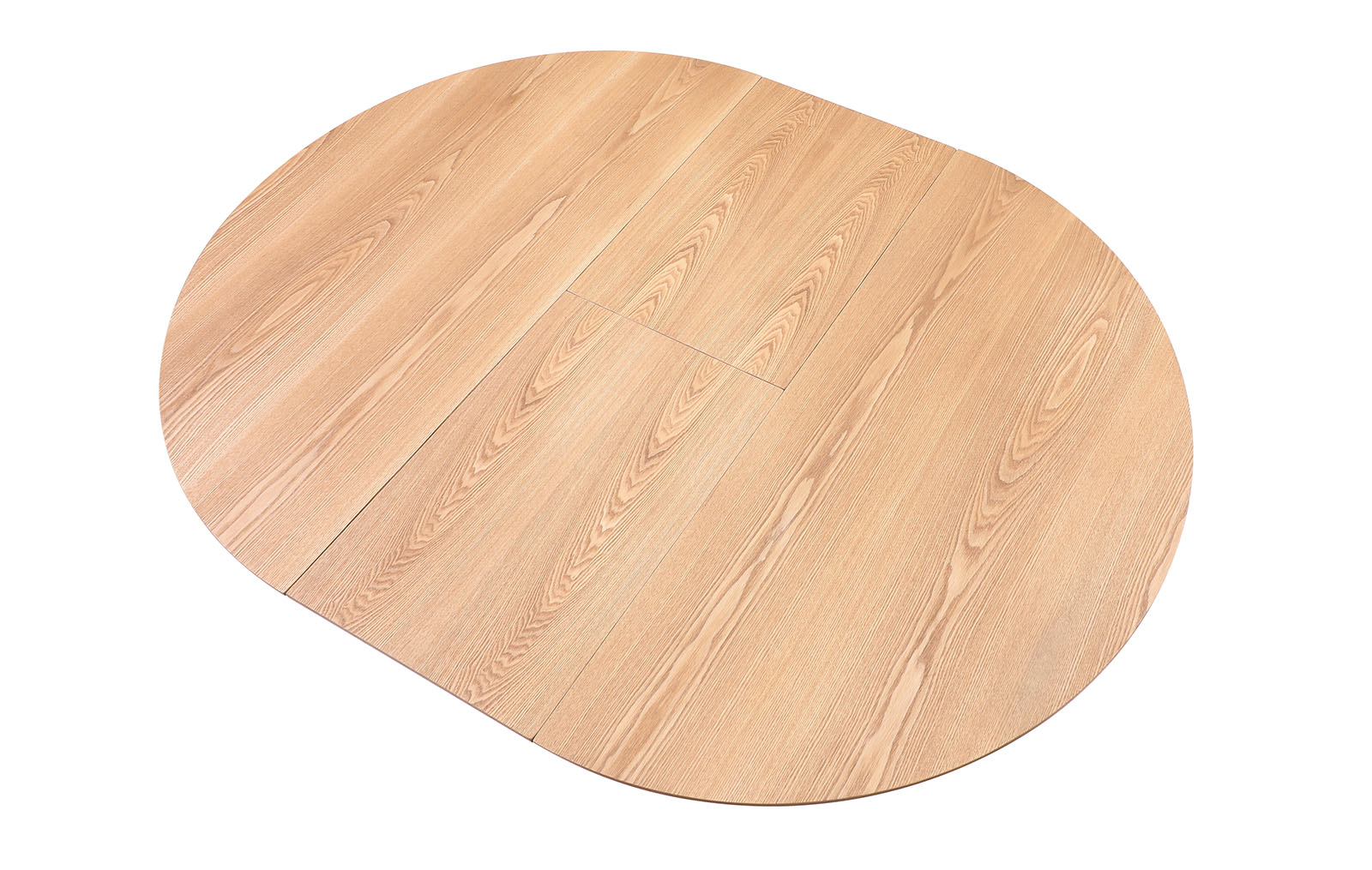 Круглый стол Enjoy в отделке натуральным шпоном ясеня легко раскладывается в овальный при необходимости увеличить длину стола.