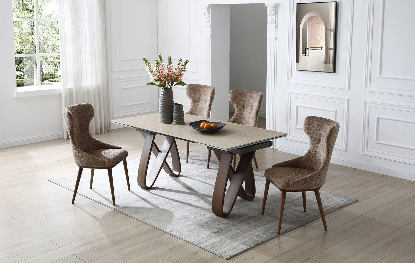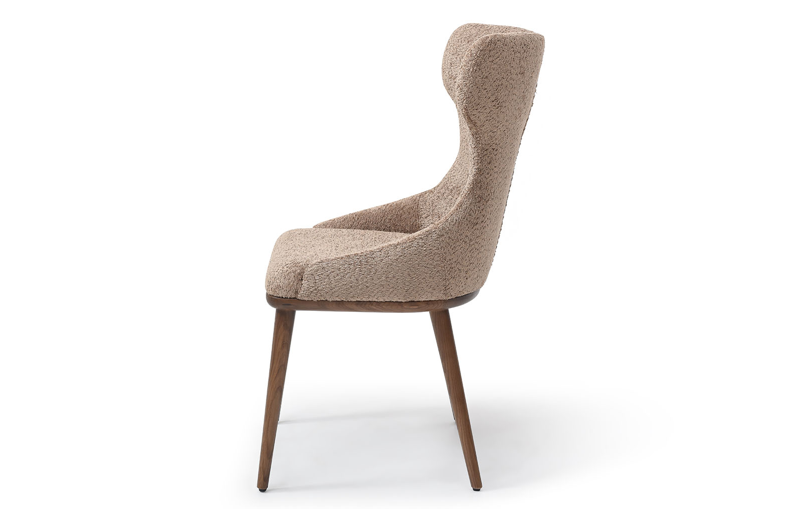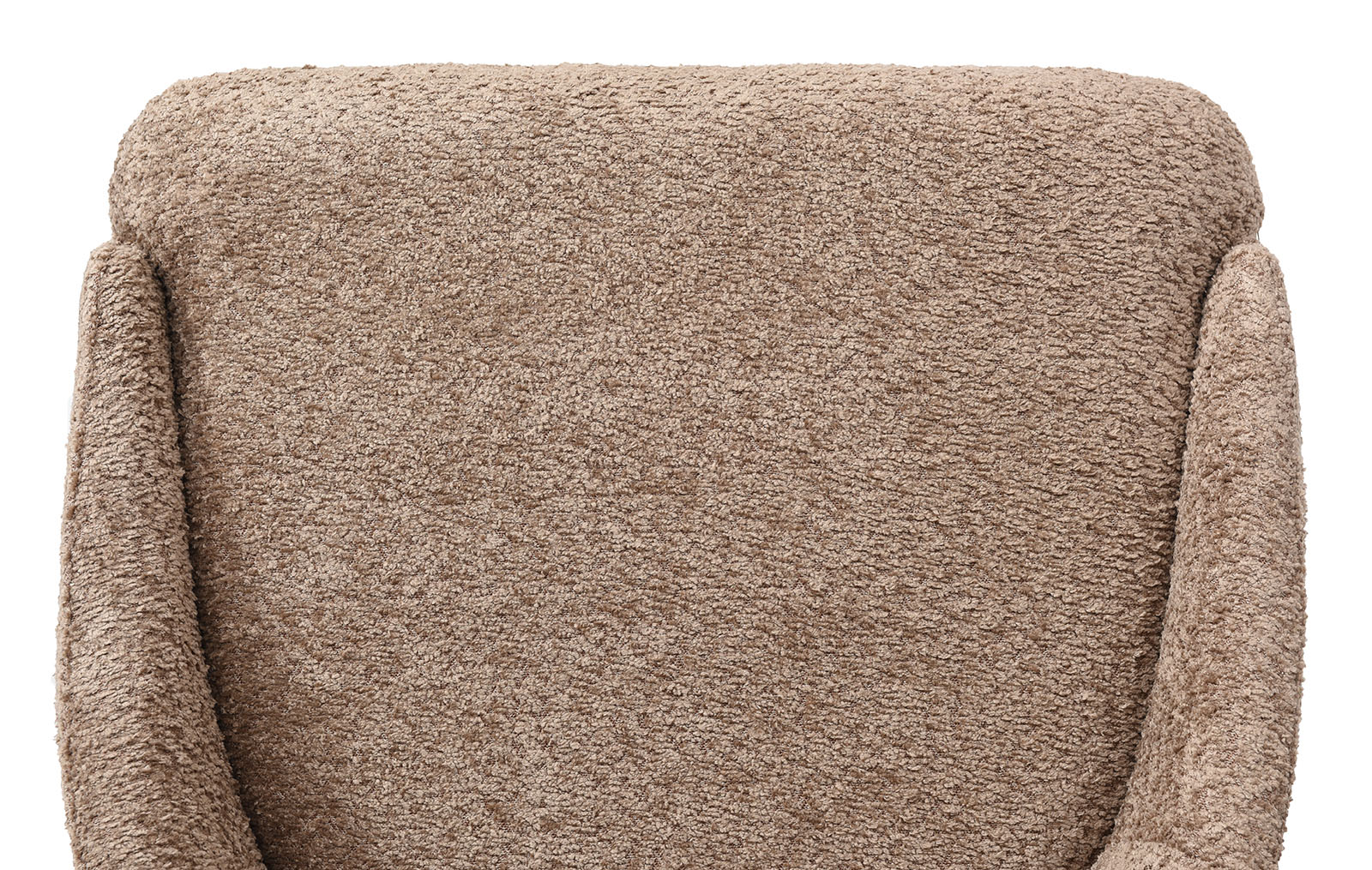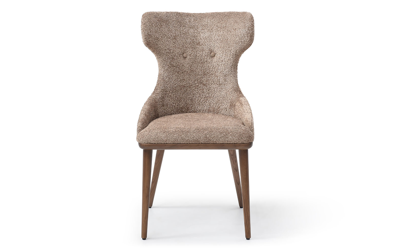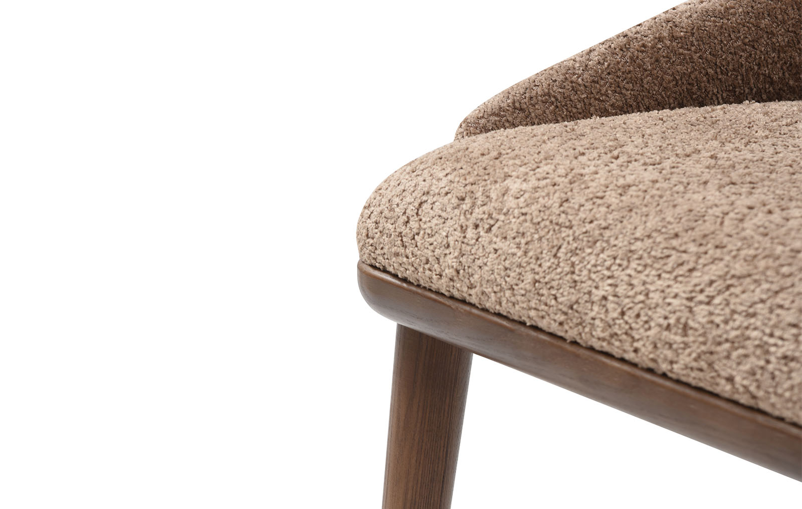 Обеденный стул Augusta (Августа) имеет обивку из ткани тедди в оттенке капучино и ножки из дерева в оттенке ореха.