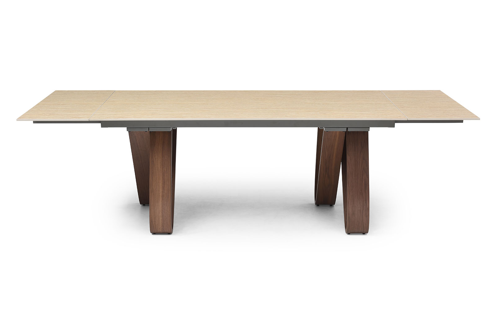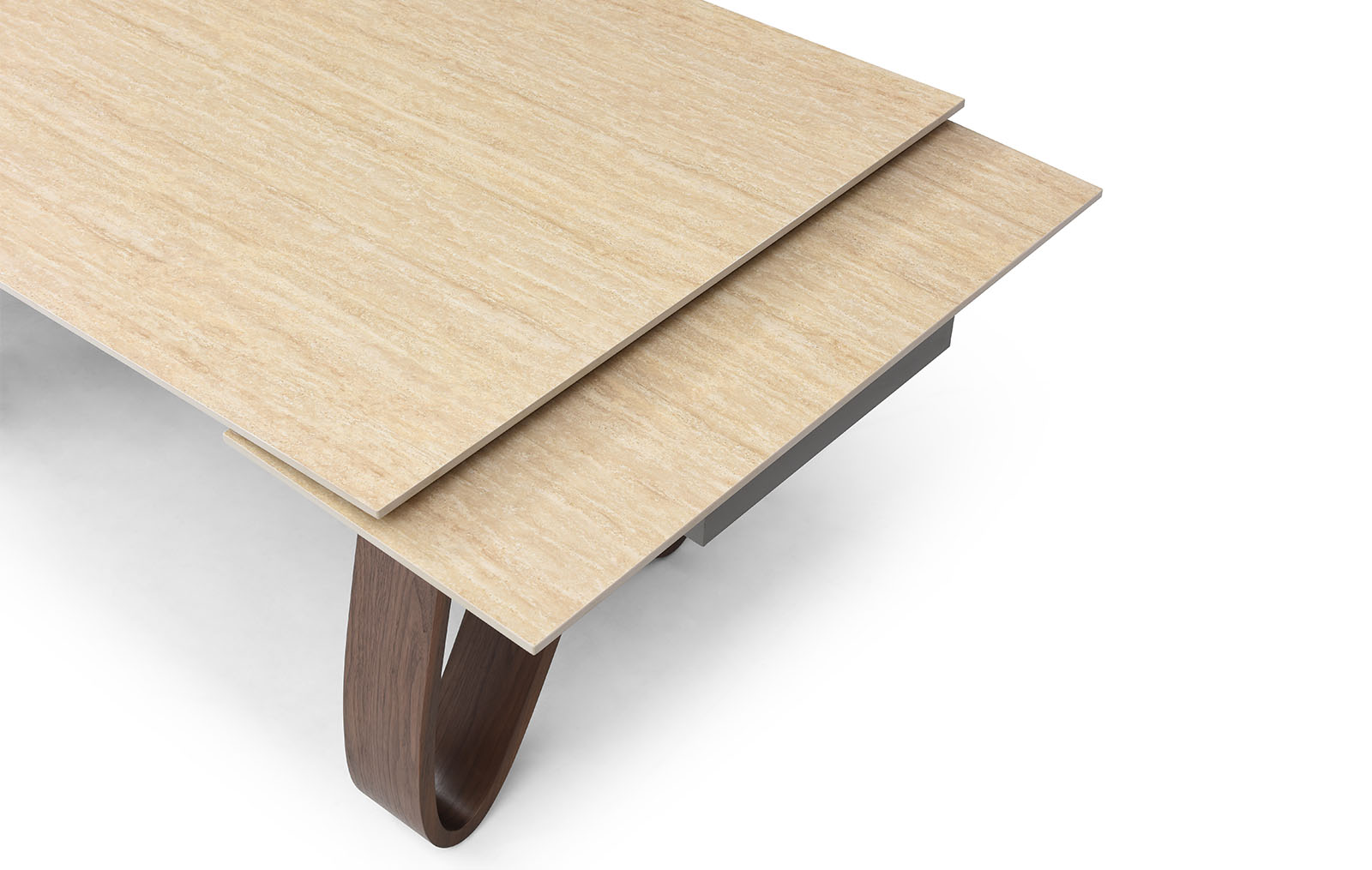 Длину стола можно увеличить с помощью двух выдвижных частей по 40 см. Две дополнительные выдвижные поверхности удобно прячутся под столешницей.