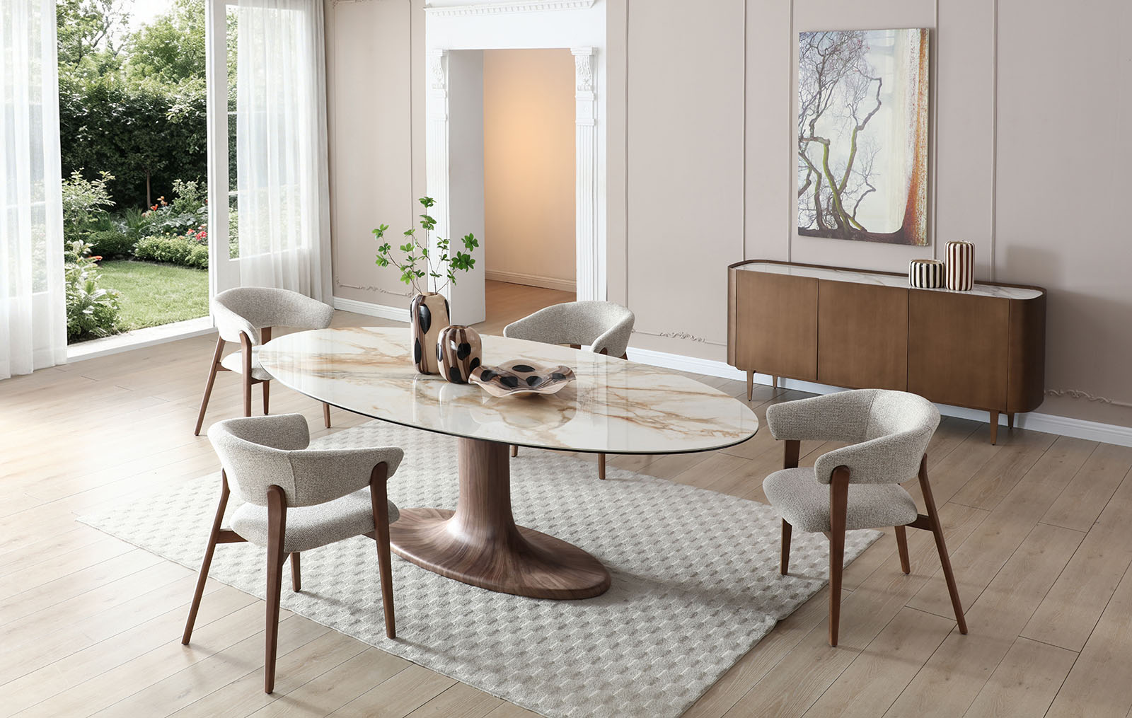 Эффектный овальный обеденный стол Lucia (Люсия) с керамической столешницей станет центральным элементом обеденной зоны. Благодаря внушительным размерам он с комфортом разместит большую семью и гостей, создавая атмосферу уюта и гостеприимства.