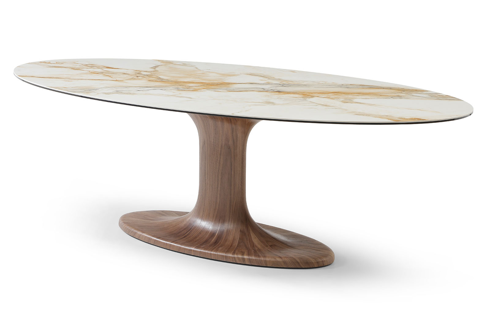 Основание стола изготовлено из прочного стекловолокна и покрыто натуральным шпоном ореха. Теплая текстура древесины подчеркивает благородный характер модели и придает интерьеру статусность. Центральная опора обеспечивает устойчивость и удобство размещения стульев по периметру.
