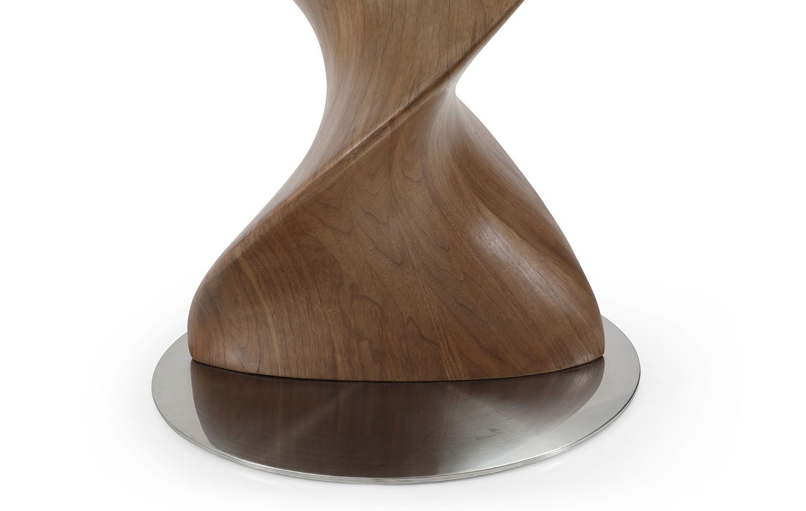 Круглая столешница из черной керамики и стекла имеет общую толщину 14 мм и диаметр 120 см. Ножка сделана из стекловолокна и шпона ореха, цвет которого очень красиво сочетается с темным оттенком столешницы. Небольшое блестящее основание круглой формы изготовлено из нержавеющей стали.