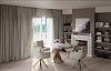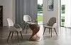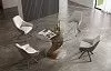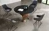 Оригинальная витая ножка стола, расположенная по центру, сделана из стекловолокна, шпонированного орехом, а ножки стульев – из металла.