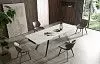 Обеденная группа, в которую входит раздвижной стол Parma (Парма) и четыре стула Hailey (Хэйли) смотрится очень эффектно. Стол с прямоугольной светлой керамической столешницей, стилизованной под каррарский мрамор, и необычными черными металлическими ножками хорошо сочетается со стульями в обивке из экокожи.