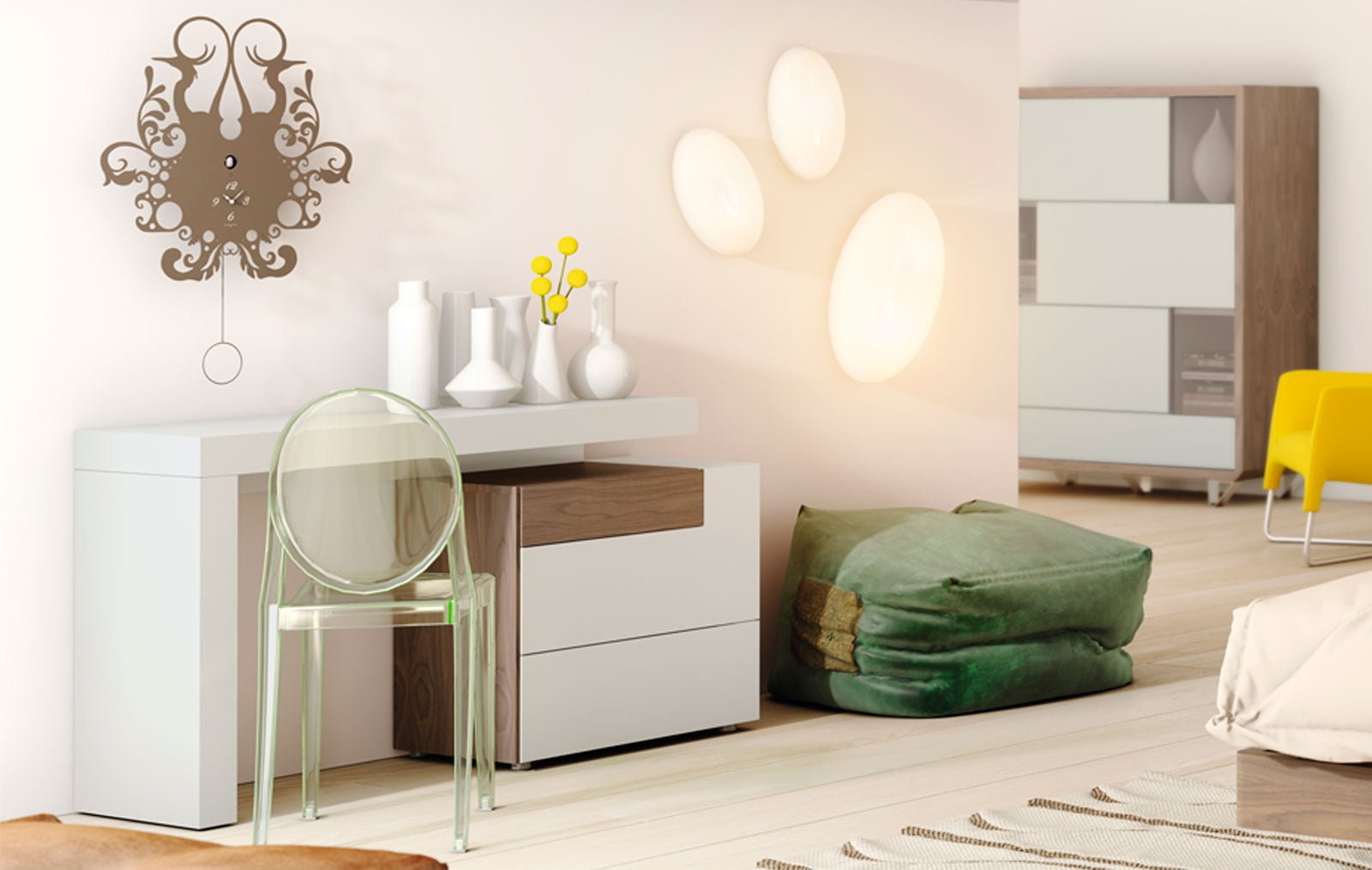 Асимметричность дизайна подчеркнута и приведена в равновесие за счет цветной вставки тумбы.