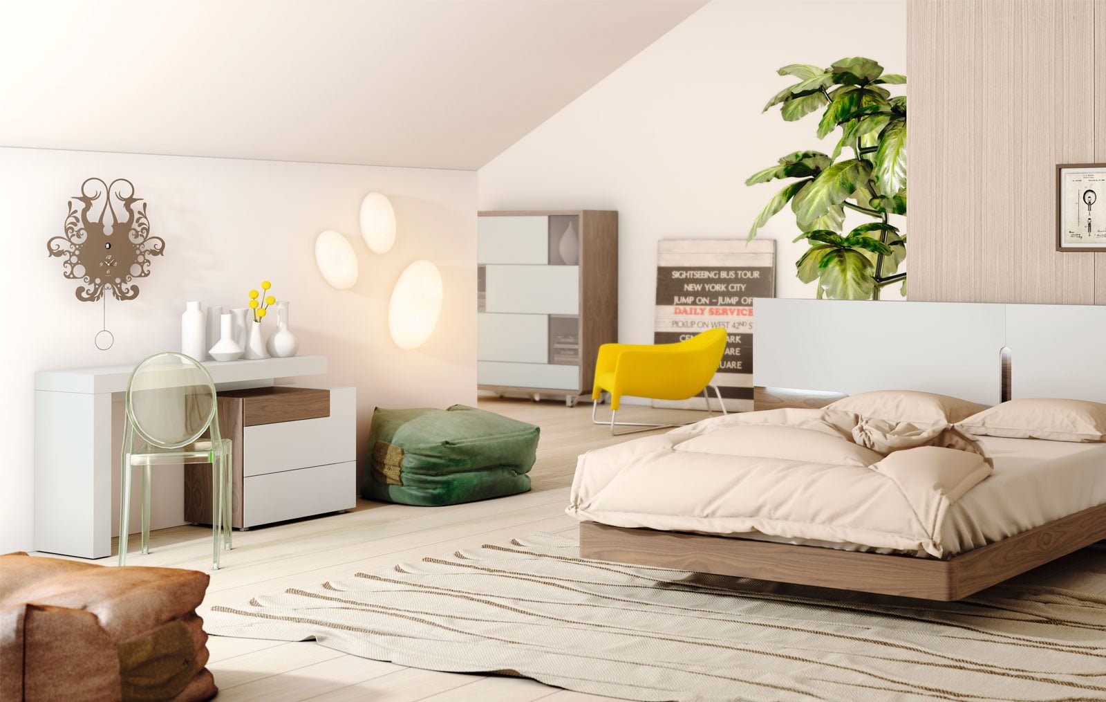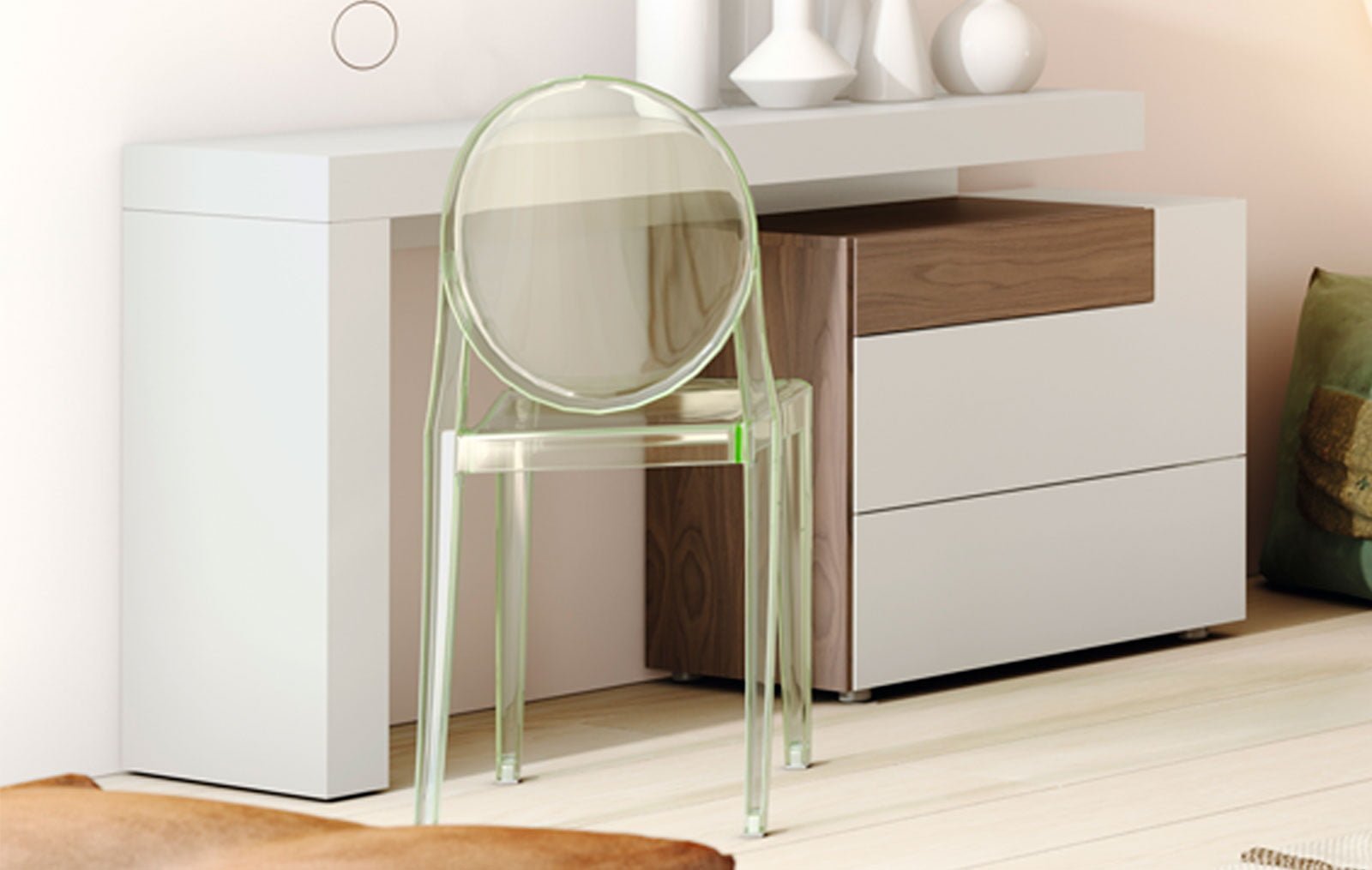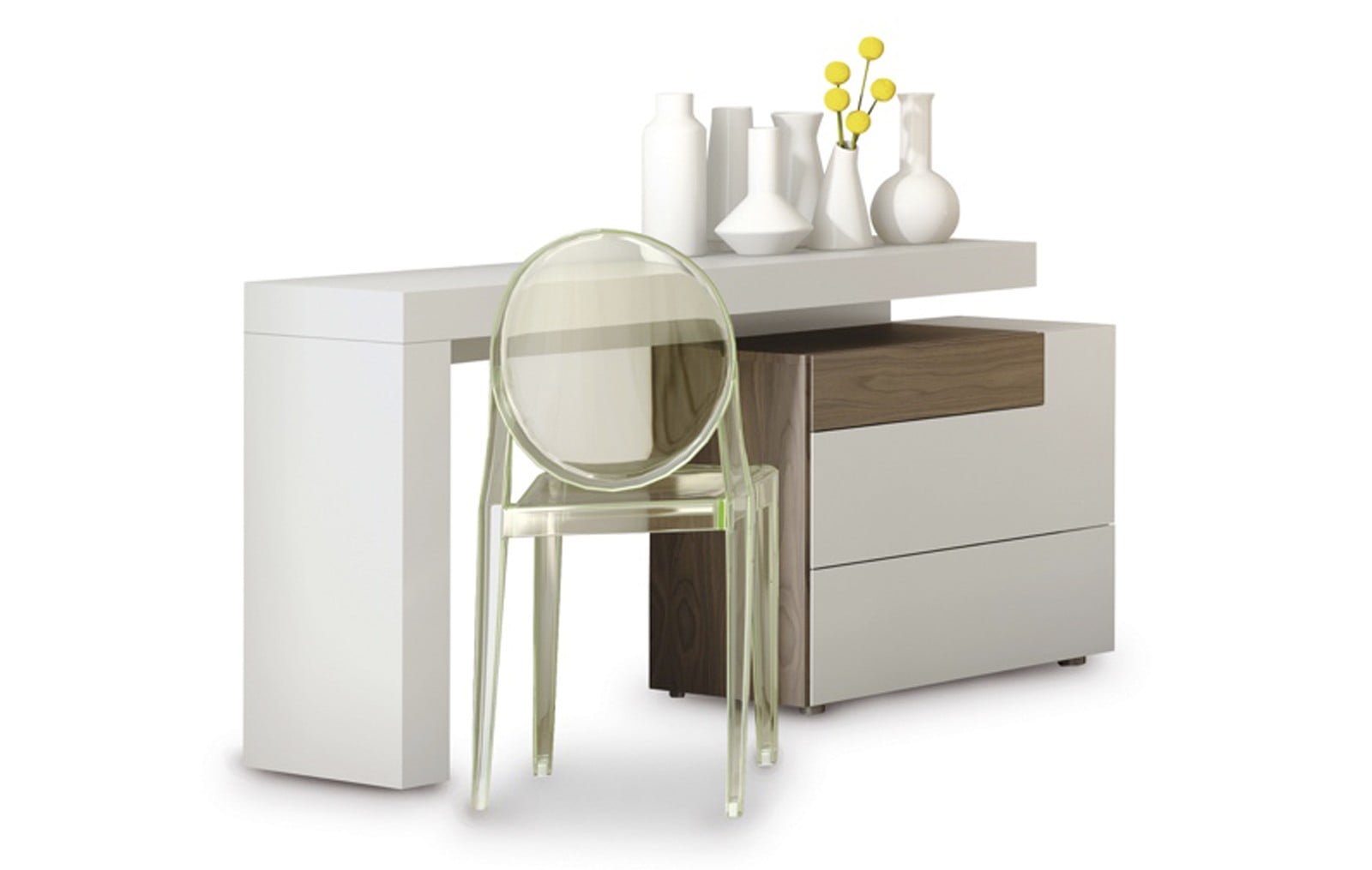 Визуально интересная форма позволяет сделать письменный стол Almeria главным акцентом современного интерьера кабинета, домашней библиотеки или даже гостиной. Ведь предназначение его может трактоваться двояко: и как рабочее место, и как композиция из консольного столика и тумбы.