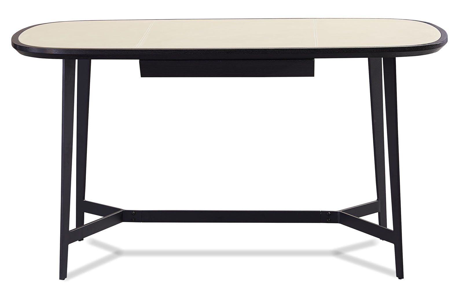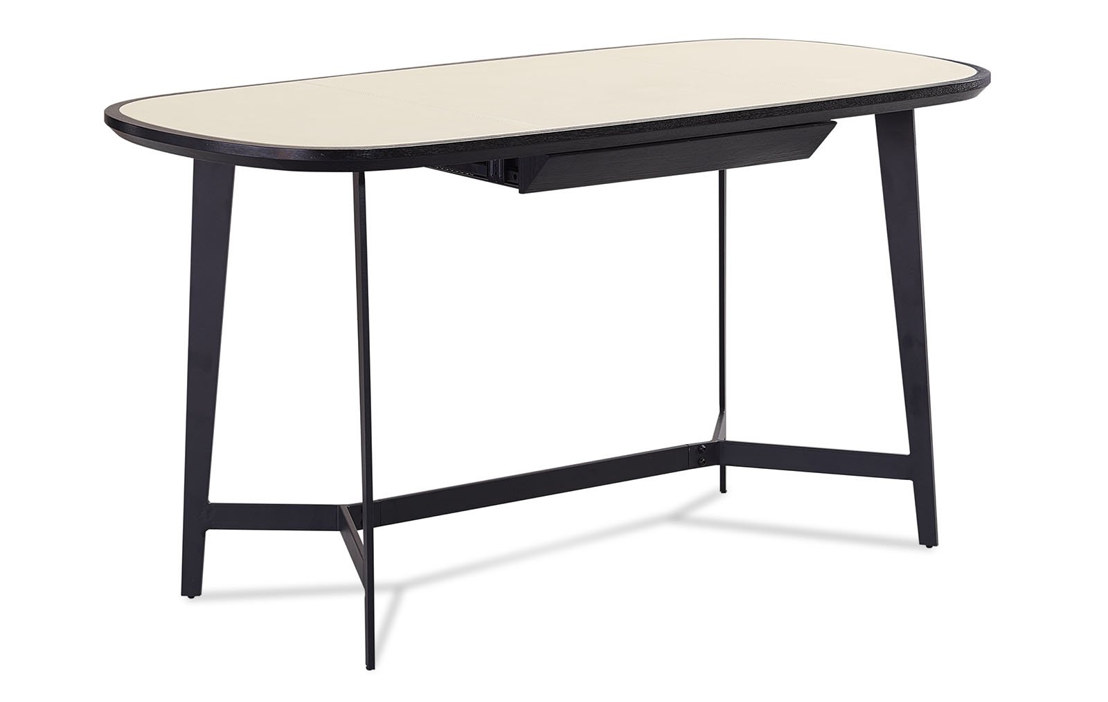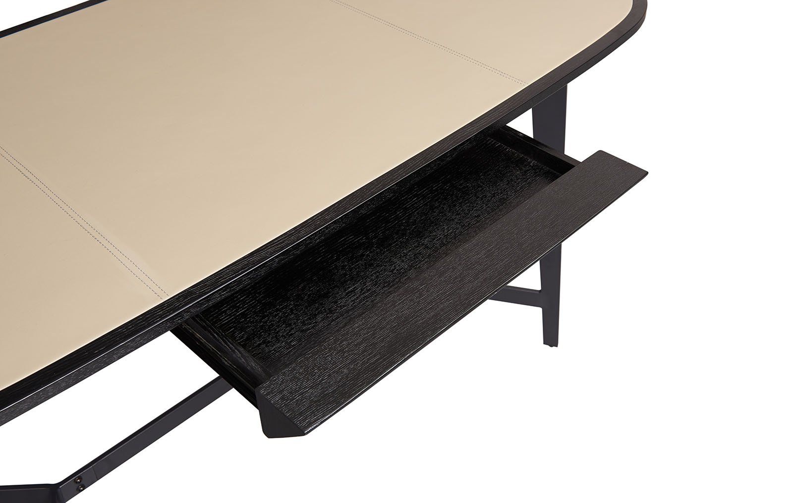 Изюминка модели – сочетание в столешнице вставок из кремовой экокожи и МДФ в шпоне темного ореха.