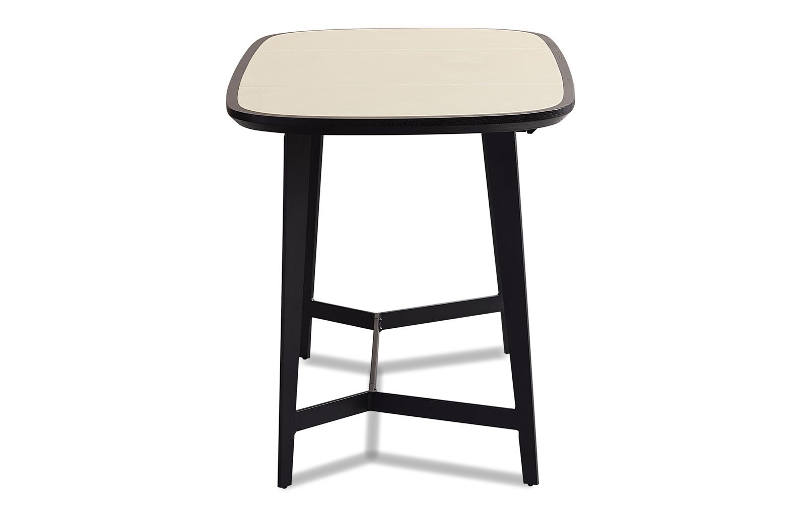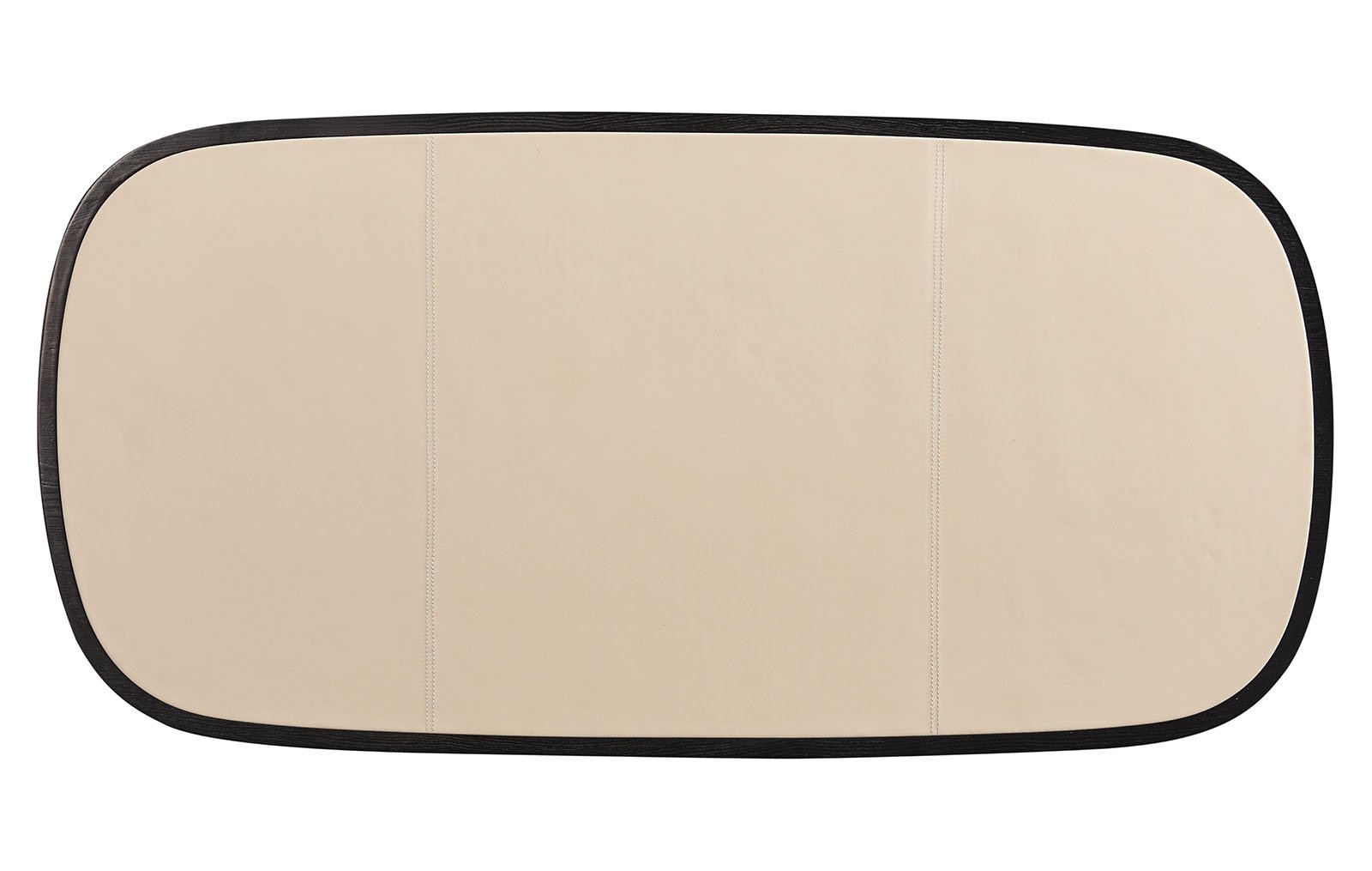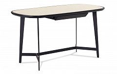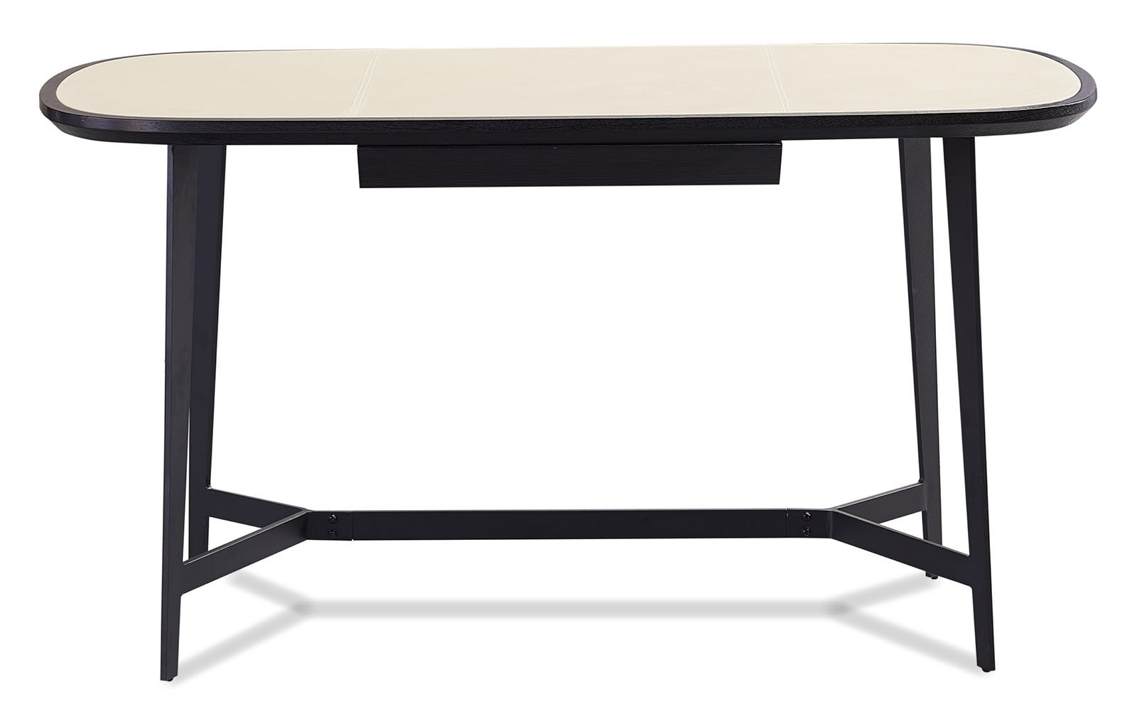 Изюминка модели – сочетание в столешнице вставок из кремовой экокожи и МДФ в шпоне темного ореха.