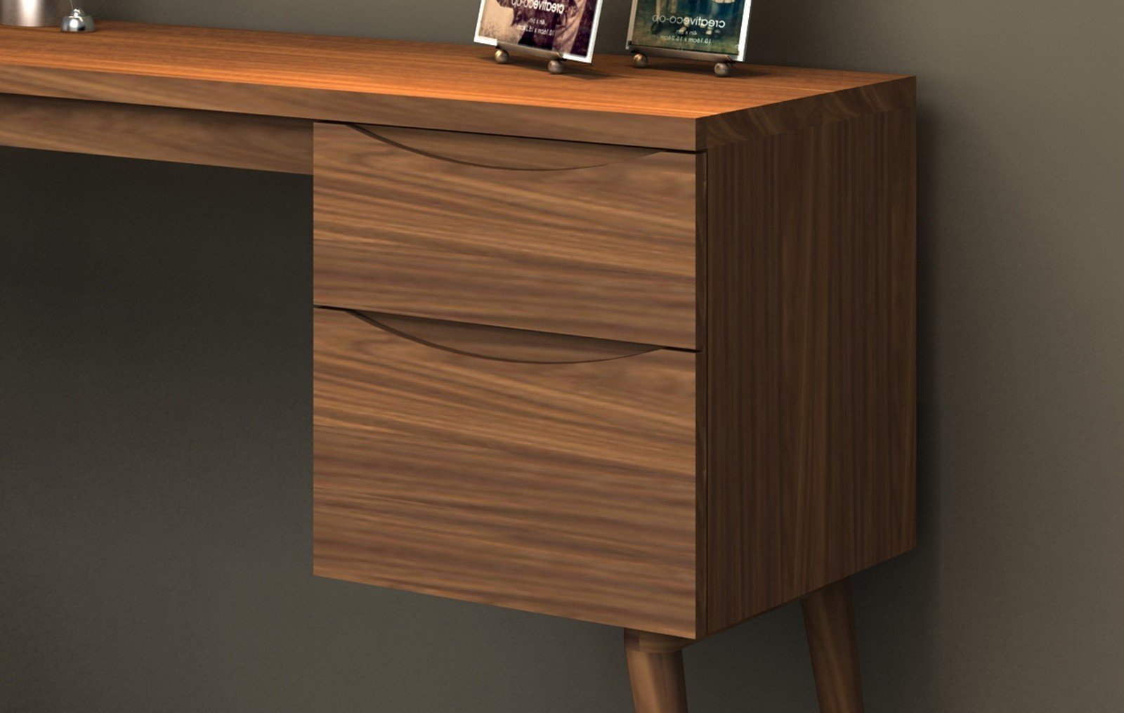 Классика мебельного жанра - письменный стол, поверхность которого шпонирована орехом, а ножки - из натурального дерева.
