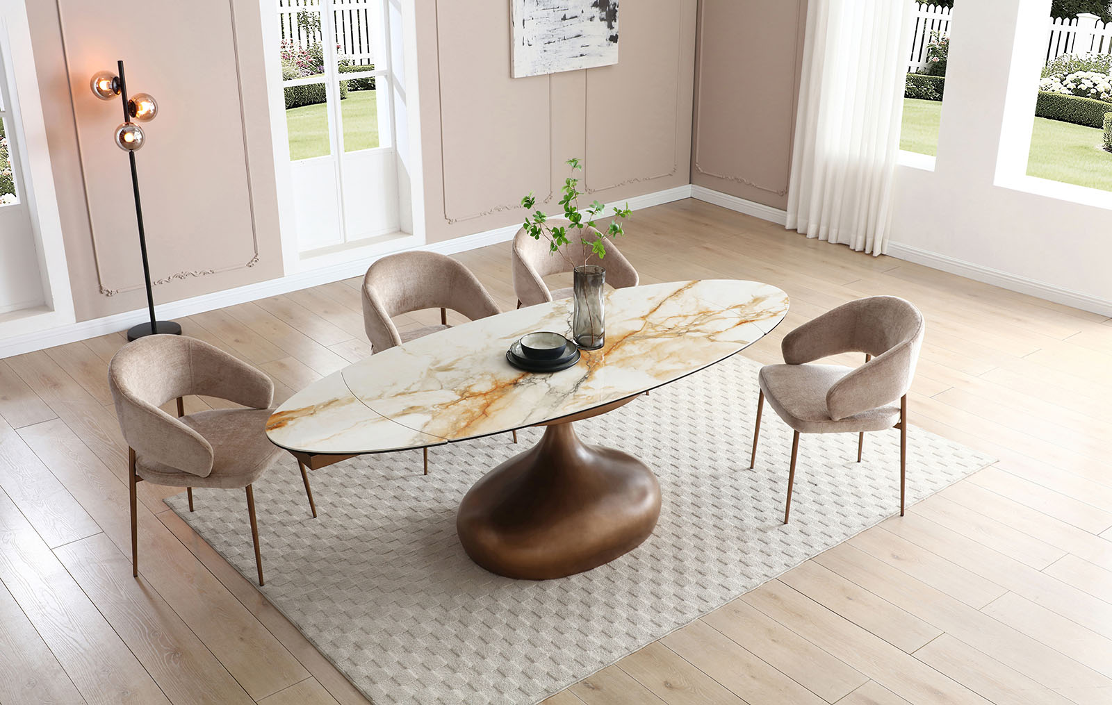 Изначально прямоугольный стол легко трансформируется в овальный благодаря раздвижному механизму.