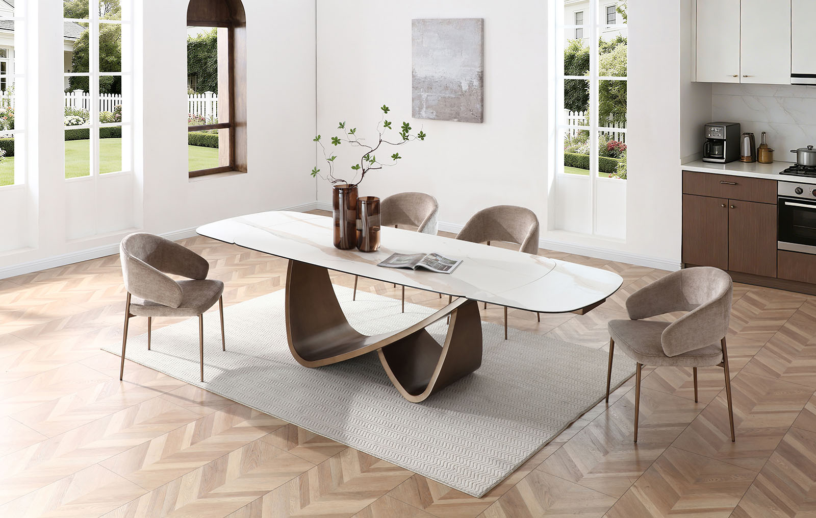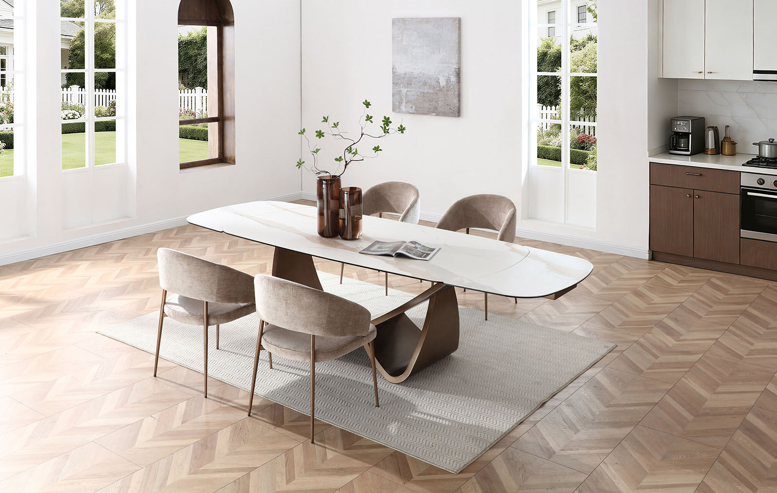 Раскладной обеденный стол Bergamo (Бергамо) с керамической столешницей длиной 200 см выполнен в элегантном стиле с акцентом на выразительную архитектурную форму подстолья.