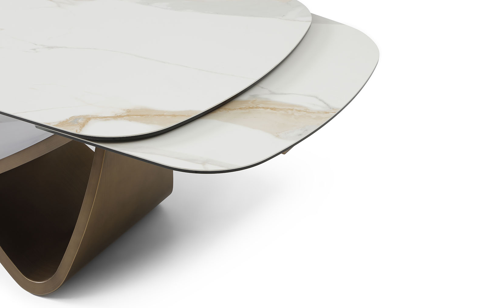 Подстолье интересной изогнутой формы выполнено из металла в матовом бронзовом оттенке.