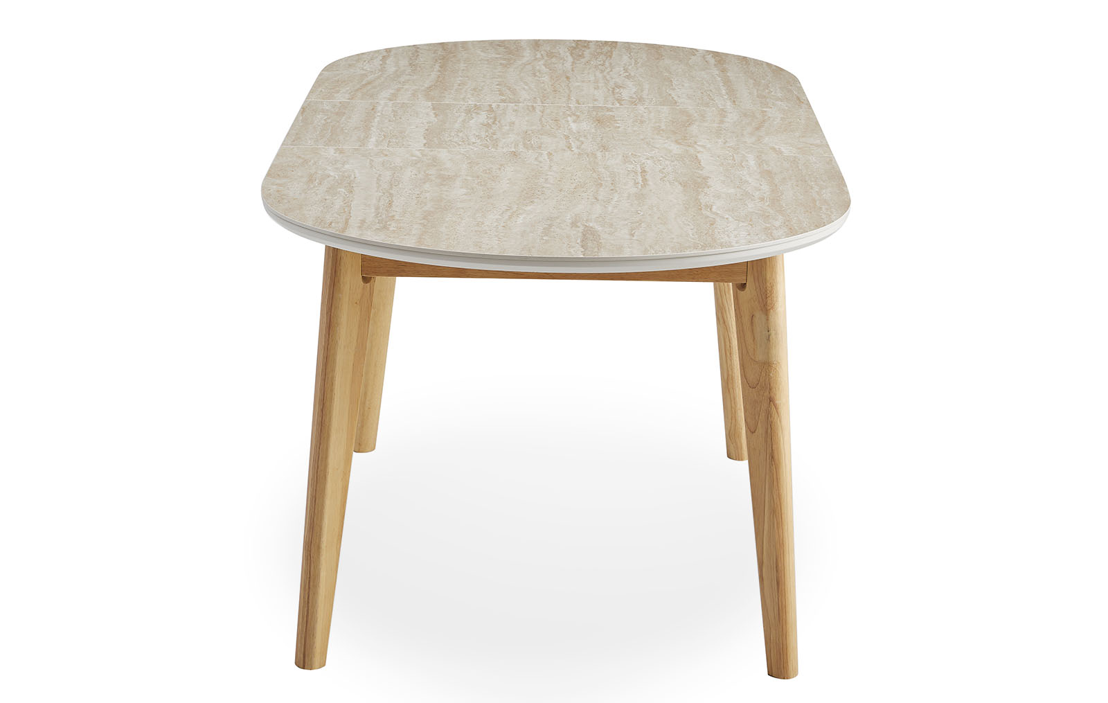Основное преимущество стола - столешница из керамики толщиной 6 мм в цвете бежевый травертин, под ней основание из MDF в матовом бежевом лаке.