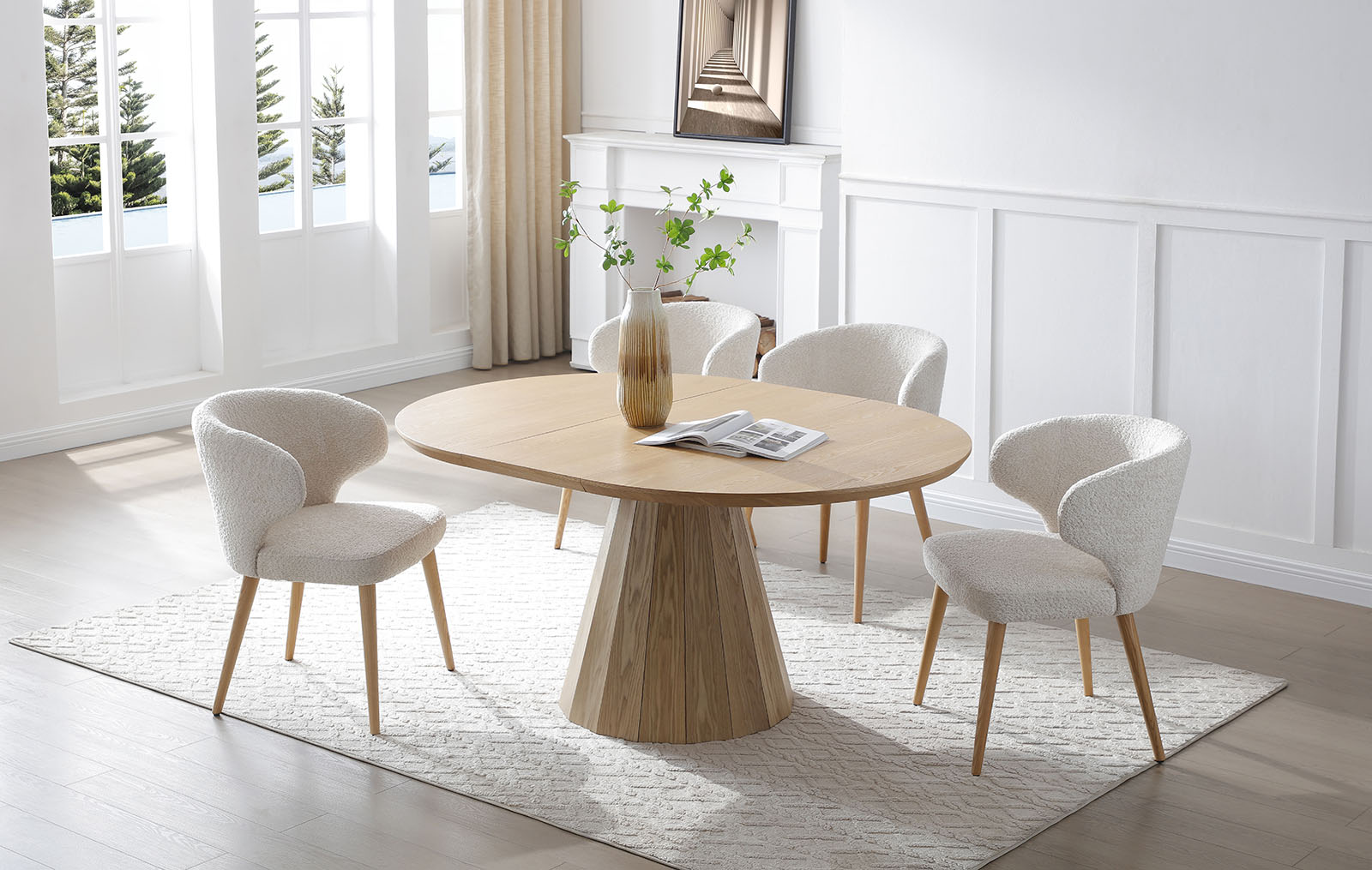 Круглый стол Enjoy (Энджой) в отделке натуральным шпоном ясеня легко раскладывается в овальный при необходимости увеличить длину стола.