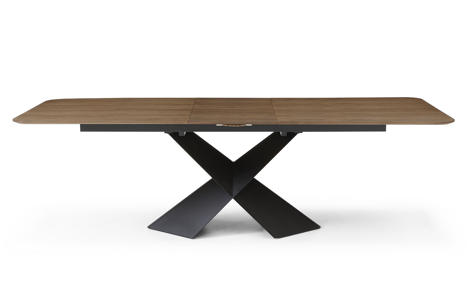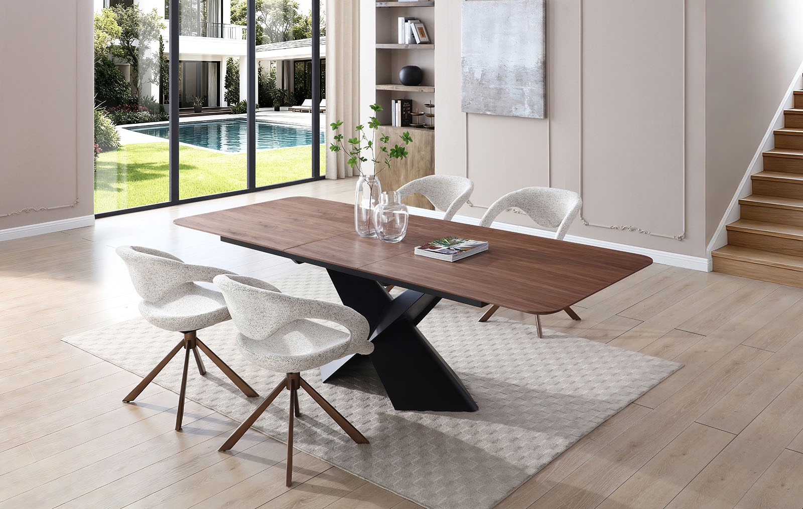Металлическое основание оригинальной геометрической формы обеспечивает устойчивость и придает столу динамичный, современный характер. Контраст дерева и металла делает модель универсальной для интерьеров в стиле лофт, контемпорари, минимализм или модерн.