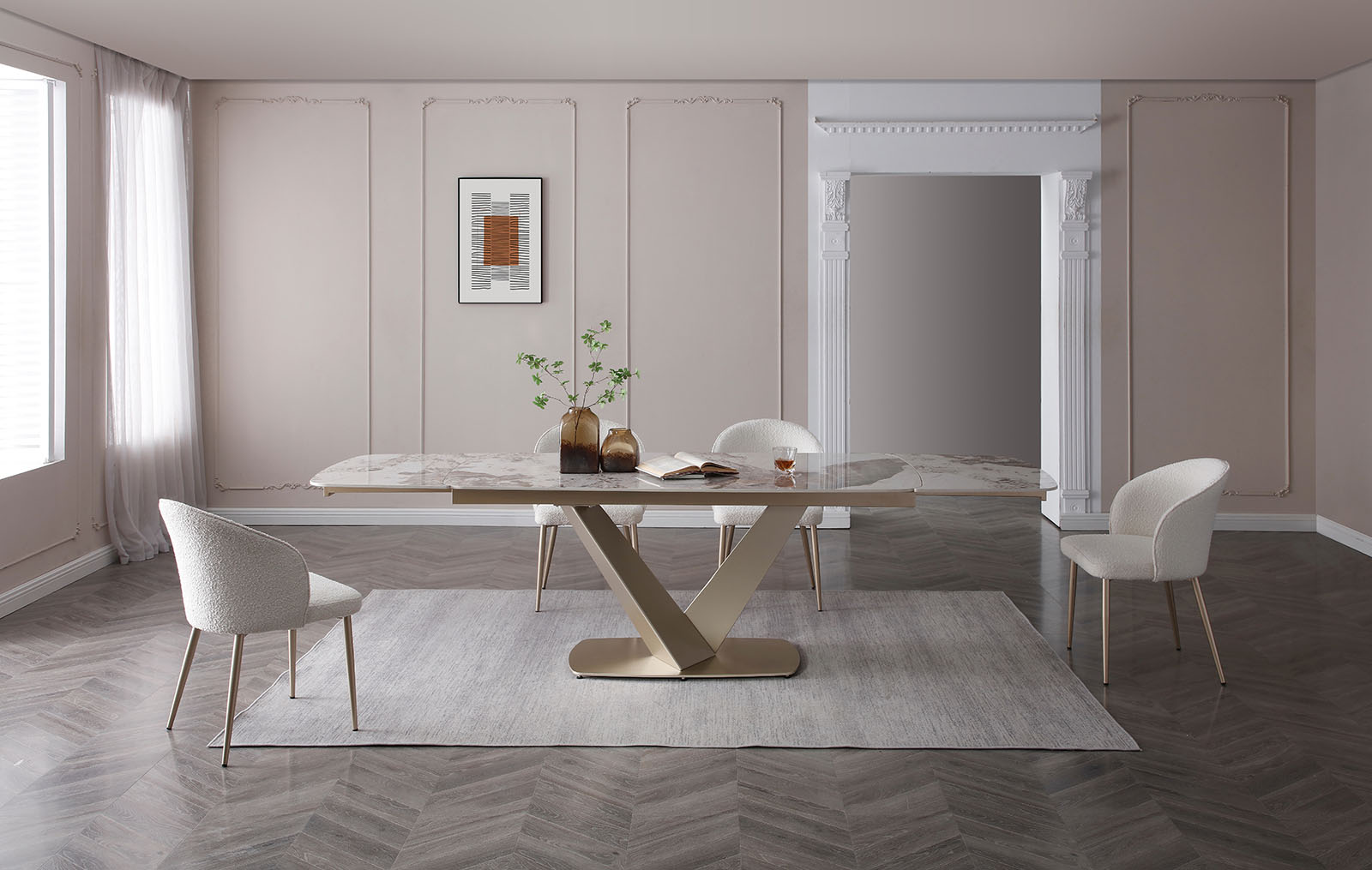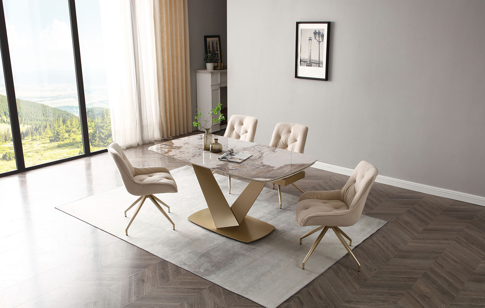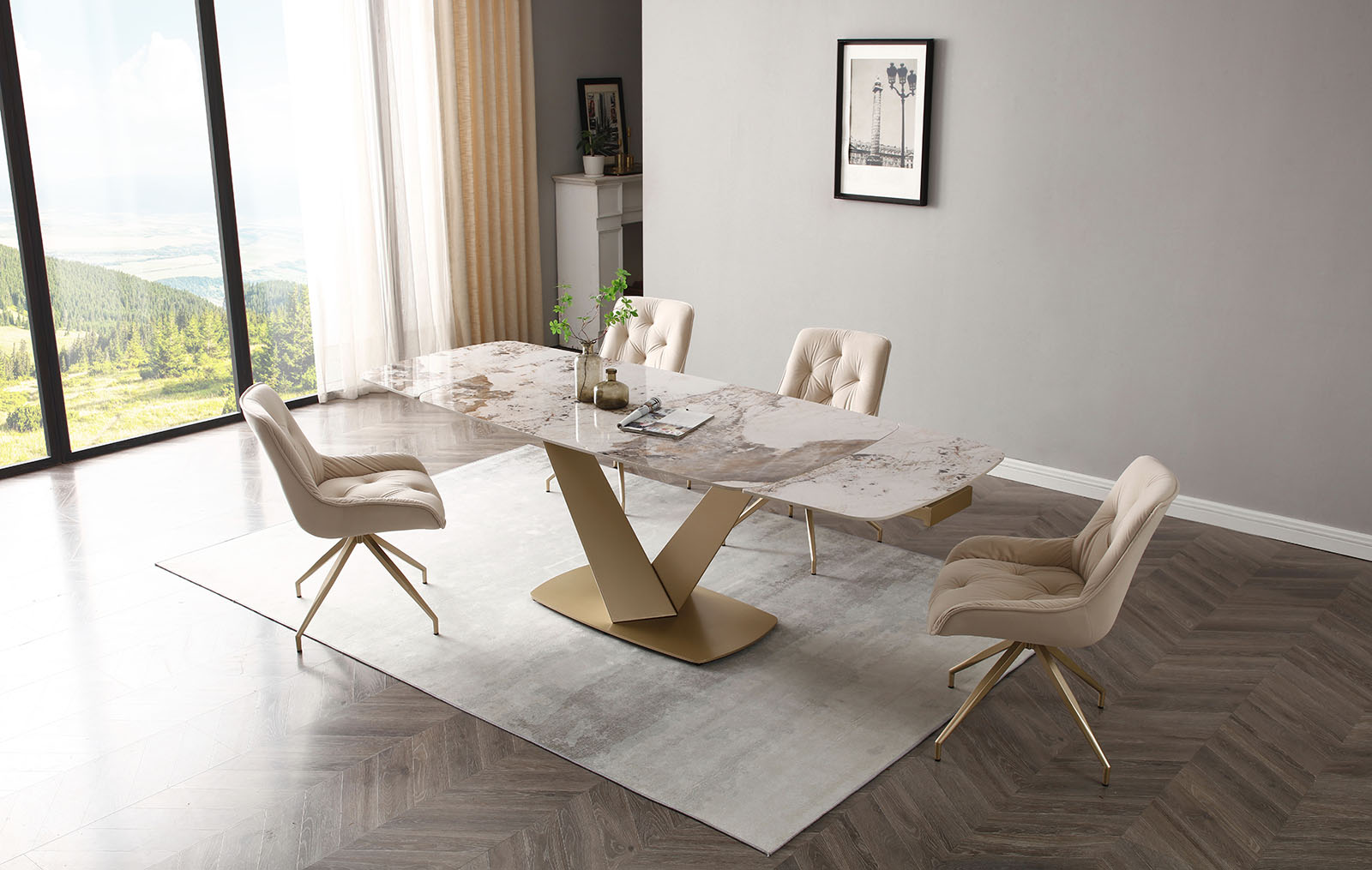 Раскладной обеденный стол Victoria (Виктория) с керамической столешницей на металлическом подстолье в цвете золотистый шампань.