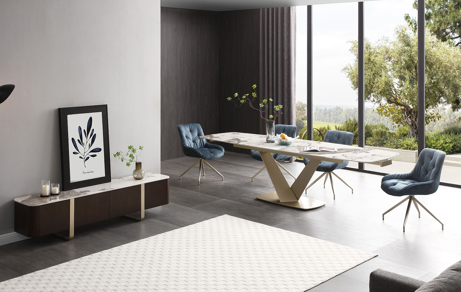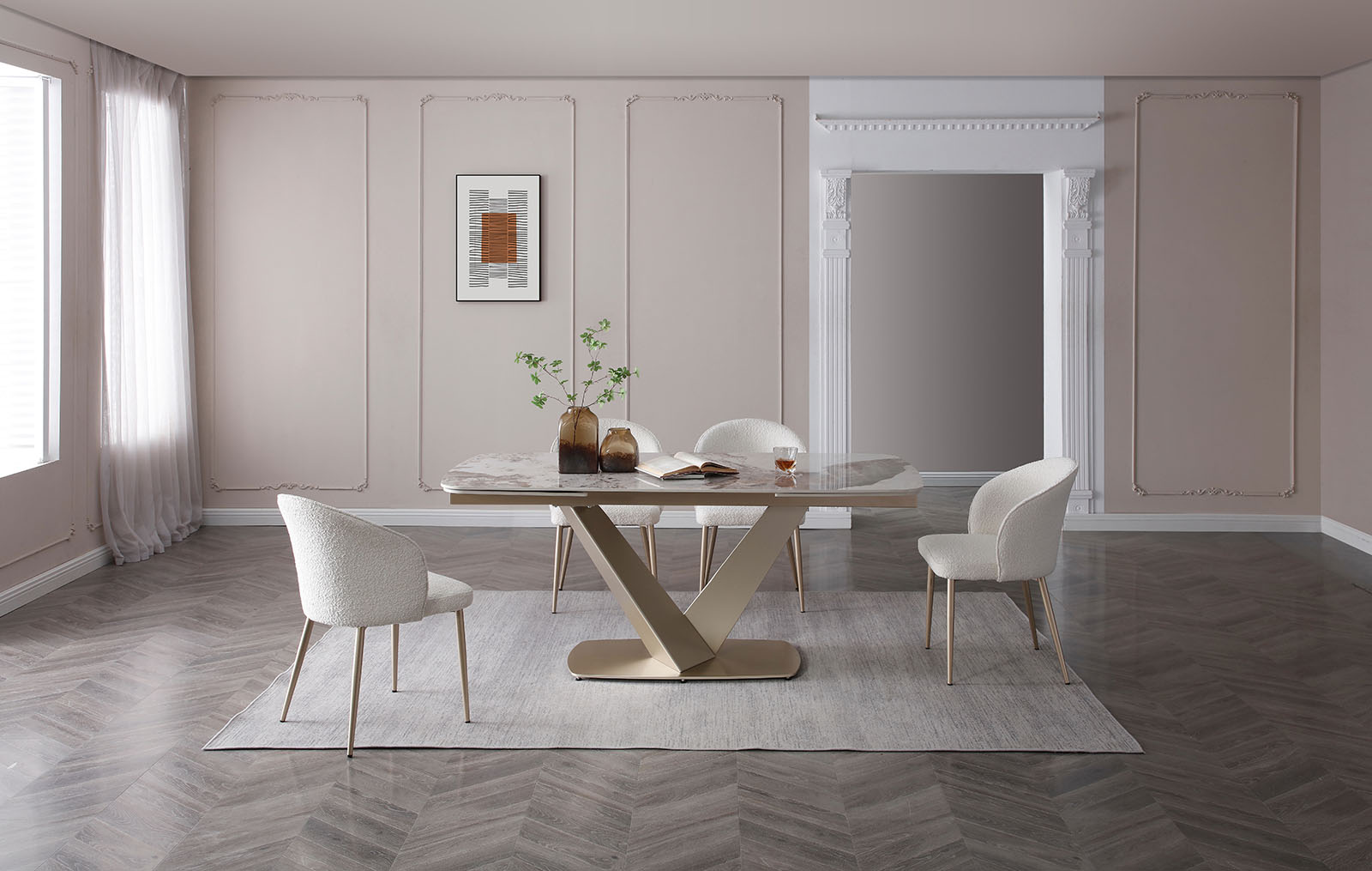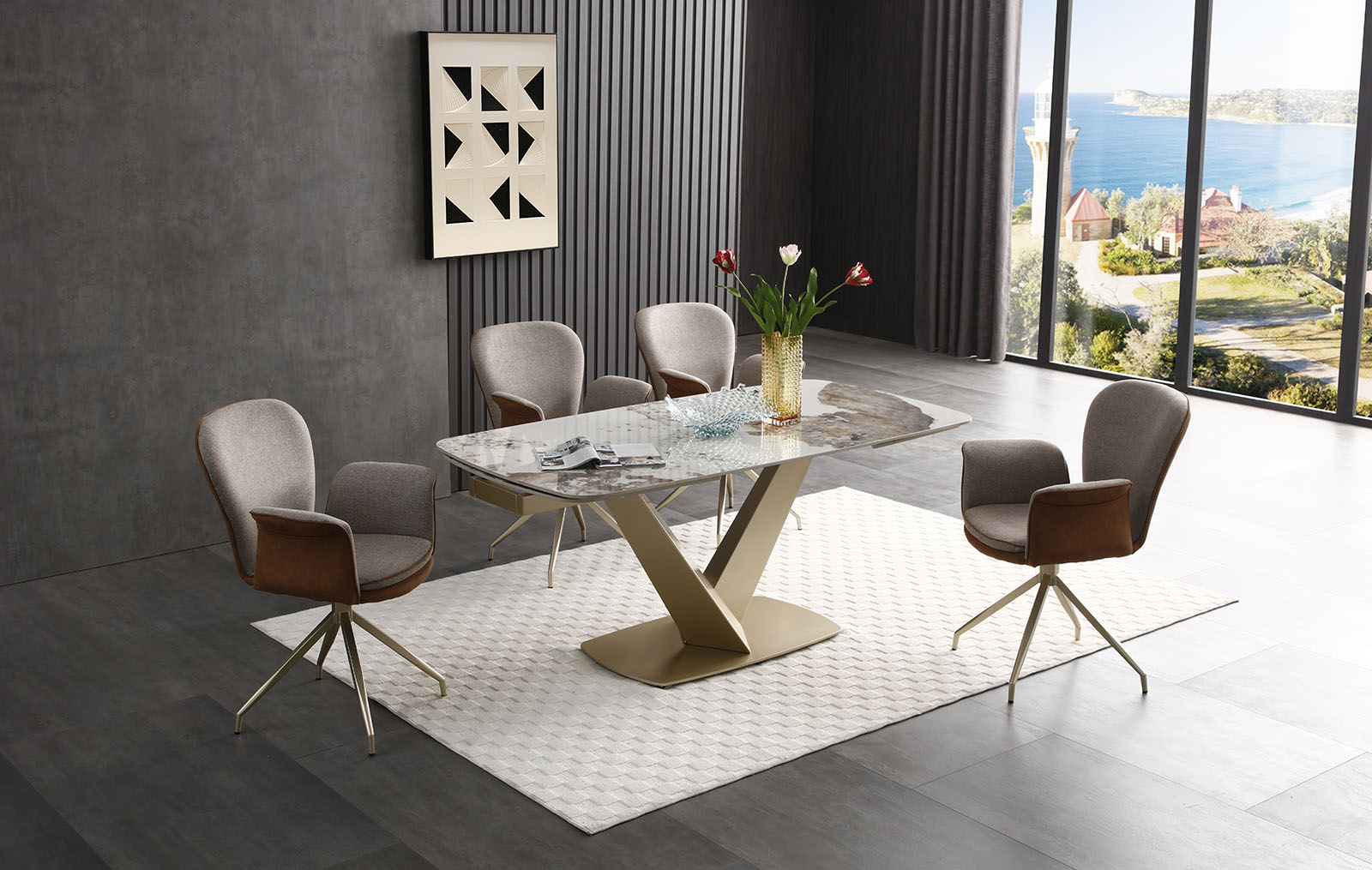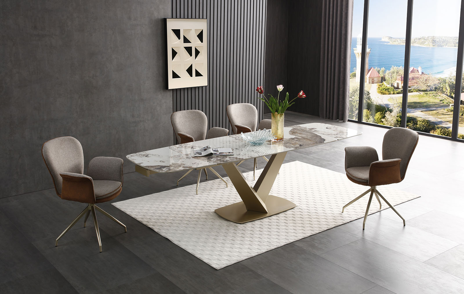 Раскладной обеденный стол Victoria (Виктория) с керамической столешницей на металлическом подстолье в цвете золотистый шампань.