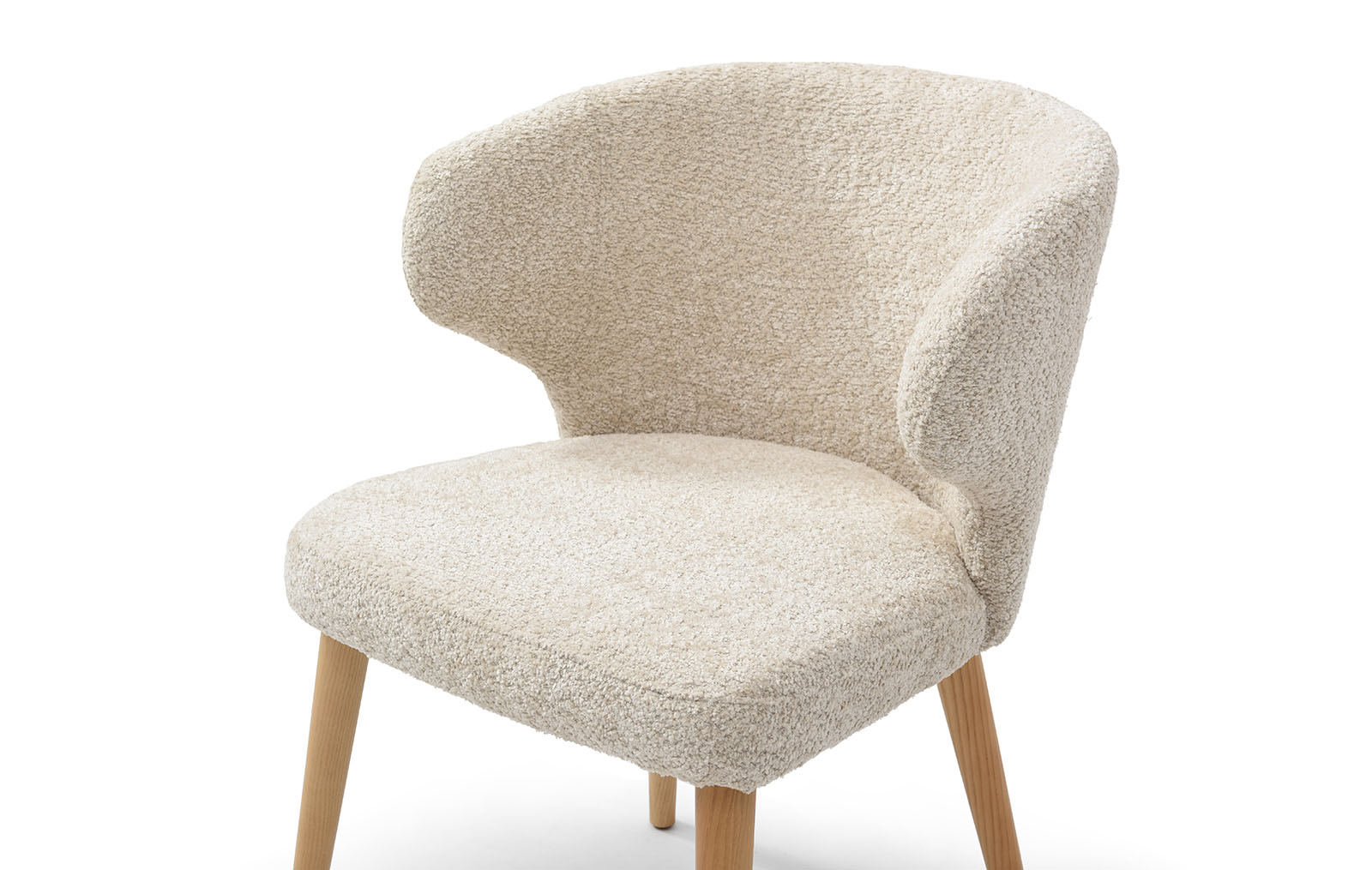 Обеденный стул Simona (Симона) имеет обивку из ткани тедди и ножки из дерева в оттенке ясеня.
