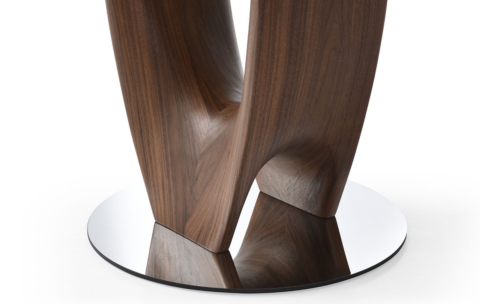 Стол с круглой столешницей из MDF и ножкой из стекловолокна, шпонированный орехом, очень удобен для использования благодаря отсутствию острых углов, достаточной вместительности (за ним могут с комфортом сесть больше людей, чем за квадратным или прямоугольным аналогичного размера).