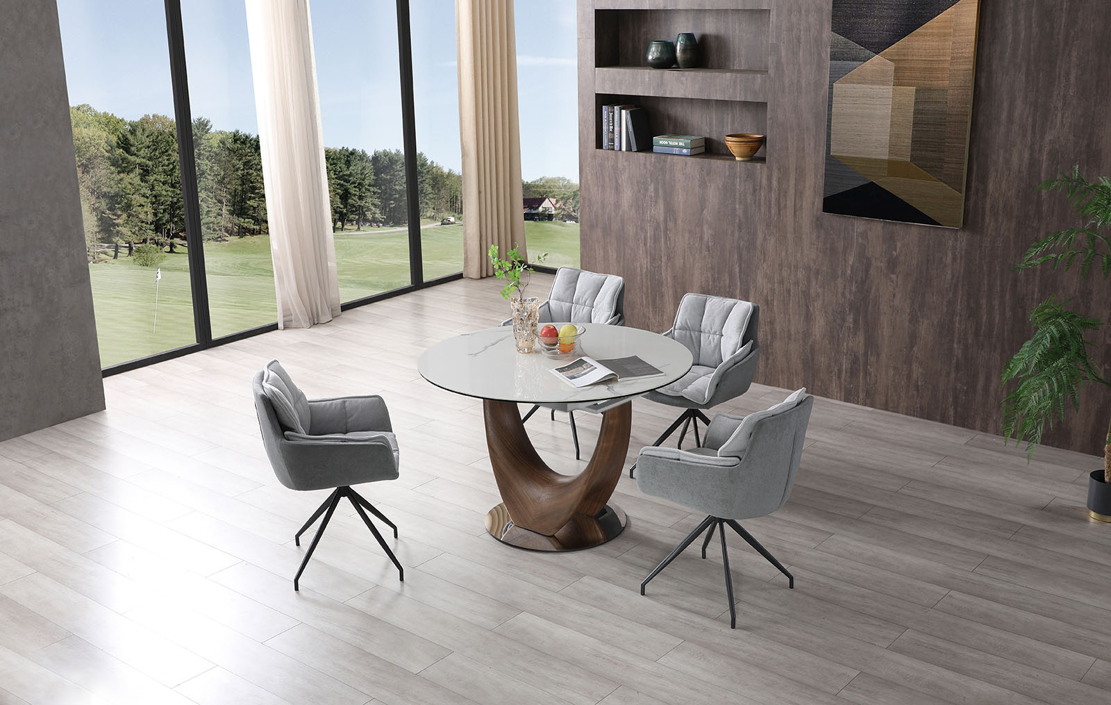 Комплект состоит из круглого раздвижного стола Triumph (Триумф) и поворотных стульев с подлокотниками Lotta (Лотта).