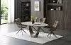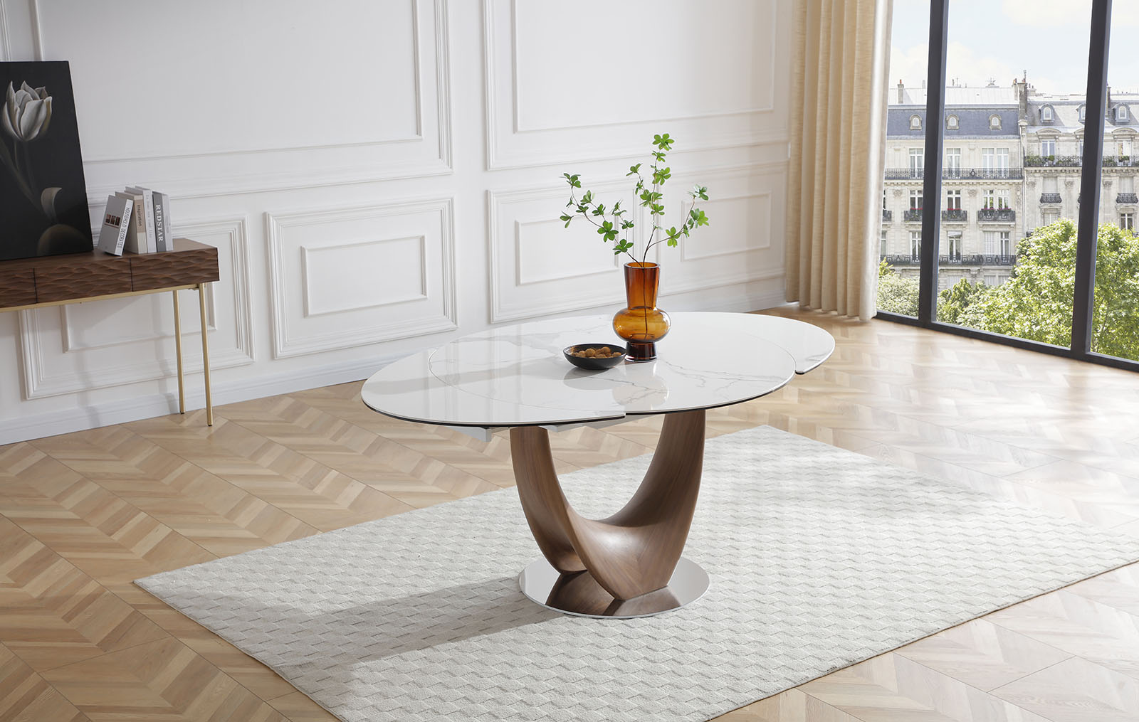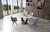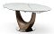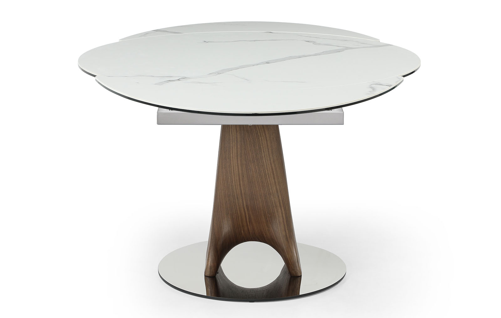 Круглая столешница из керамики и стекла имеет общую толщину 14 мм и диаметр 120 см в сложенном виде. При раскладывании длина стола увеличивается до 180 см. Две дополнительные выдвижные поверхности удобно прячутся под столешницей. Ножка причудливой изогнутой формы – из шпона ореха и стекловолокна, круглое основание – из нержавеющей стали.