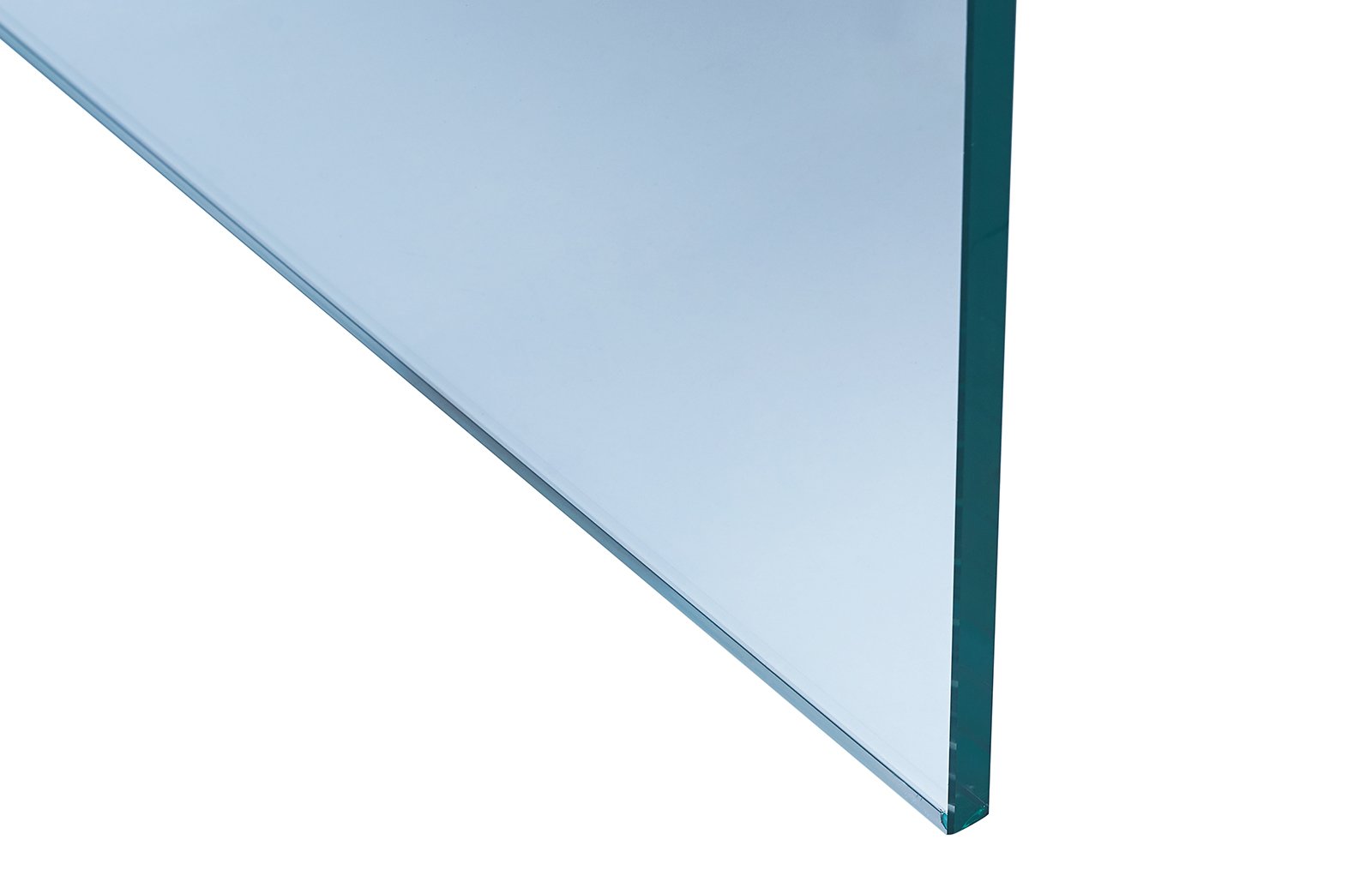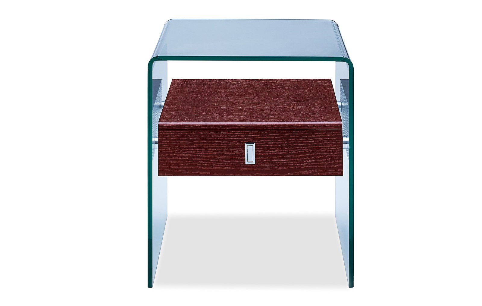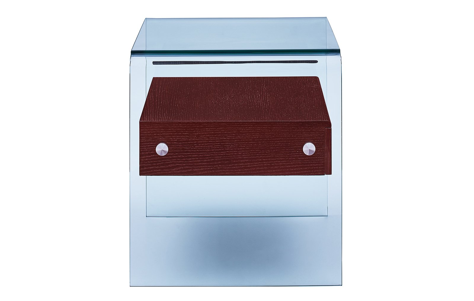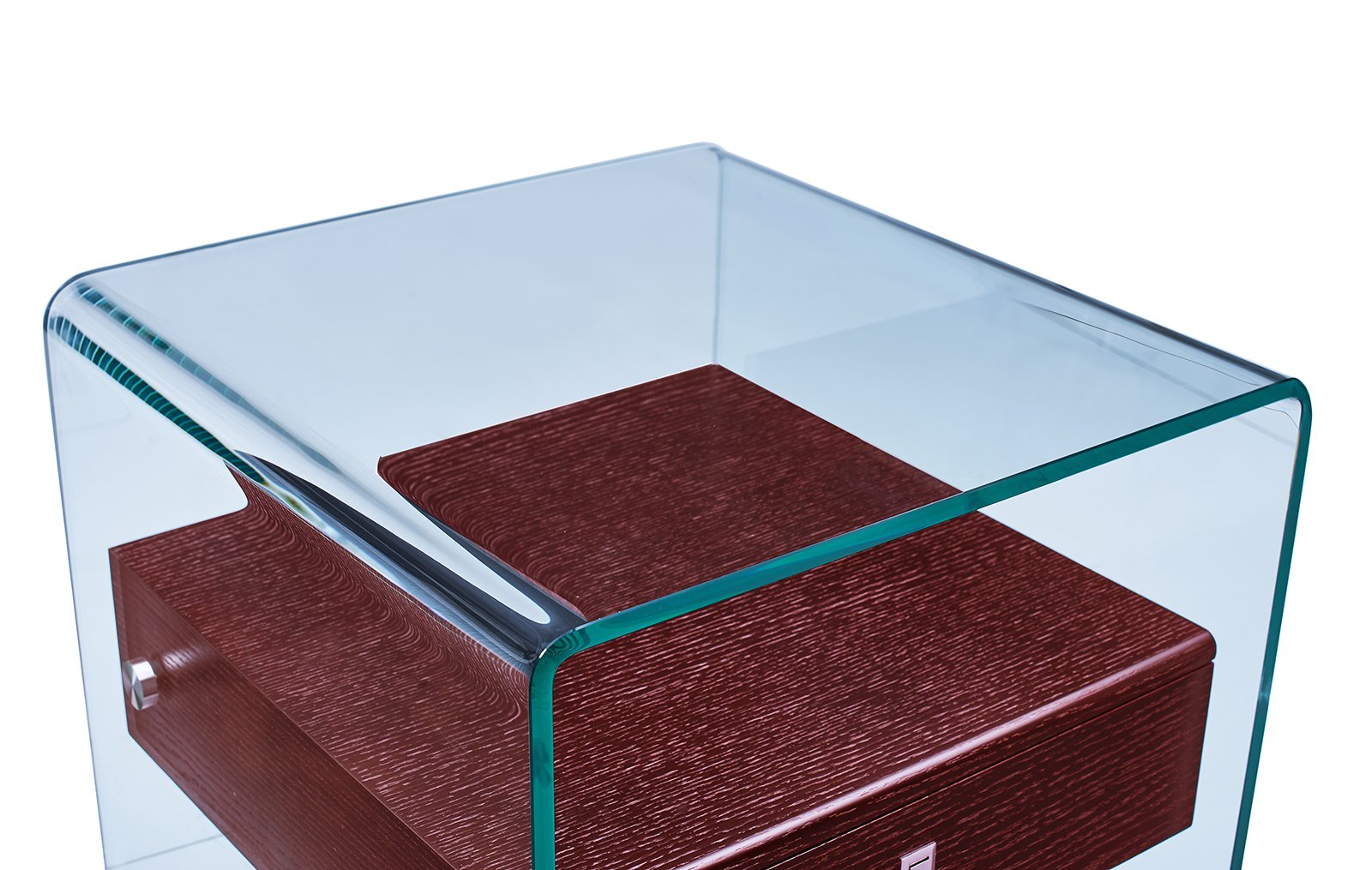 Прозрачная столешница из гнутого закаленного стекла переходит в опоры, создавая визуальный эффект невесомости. Закаленное стекло надежно: оно устойчиво к царапинам и прочим механическим повреждениям. Внутренняя вставка из МДФ в отделке вишни имеет выдвижной ящик со стильной фурнитурой. Верхняя часть ящика служит удобной полочкой.
