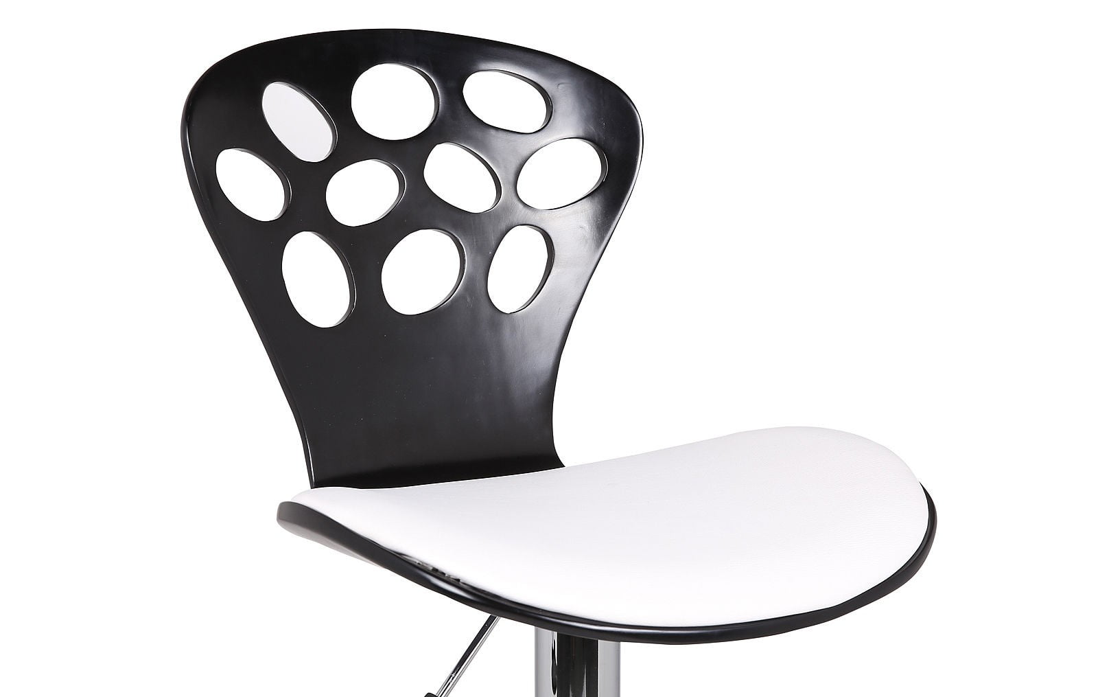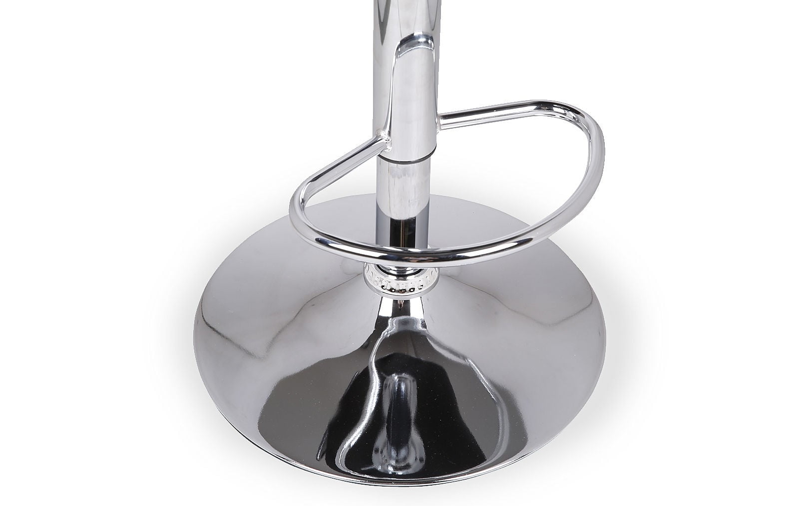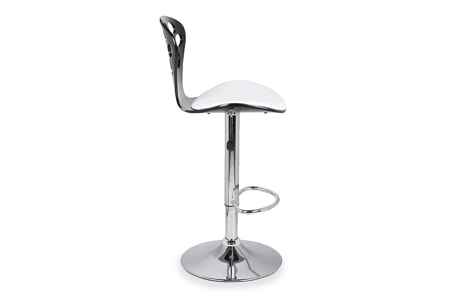 Сиденье обито белой экокожей. Сиденье регулируется по высоте от 62 до 83 см и может вращаться. Функция регулировки позволяет подобрать нужную высоту в зависимости от роста человека и высоты столешницы. Удобная спинка дает возможность сидеть с комфортом на протяжении долгого времени.