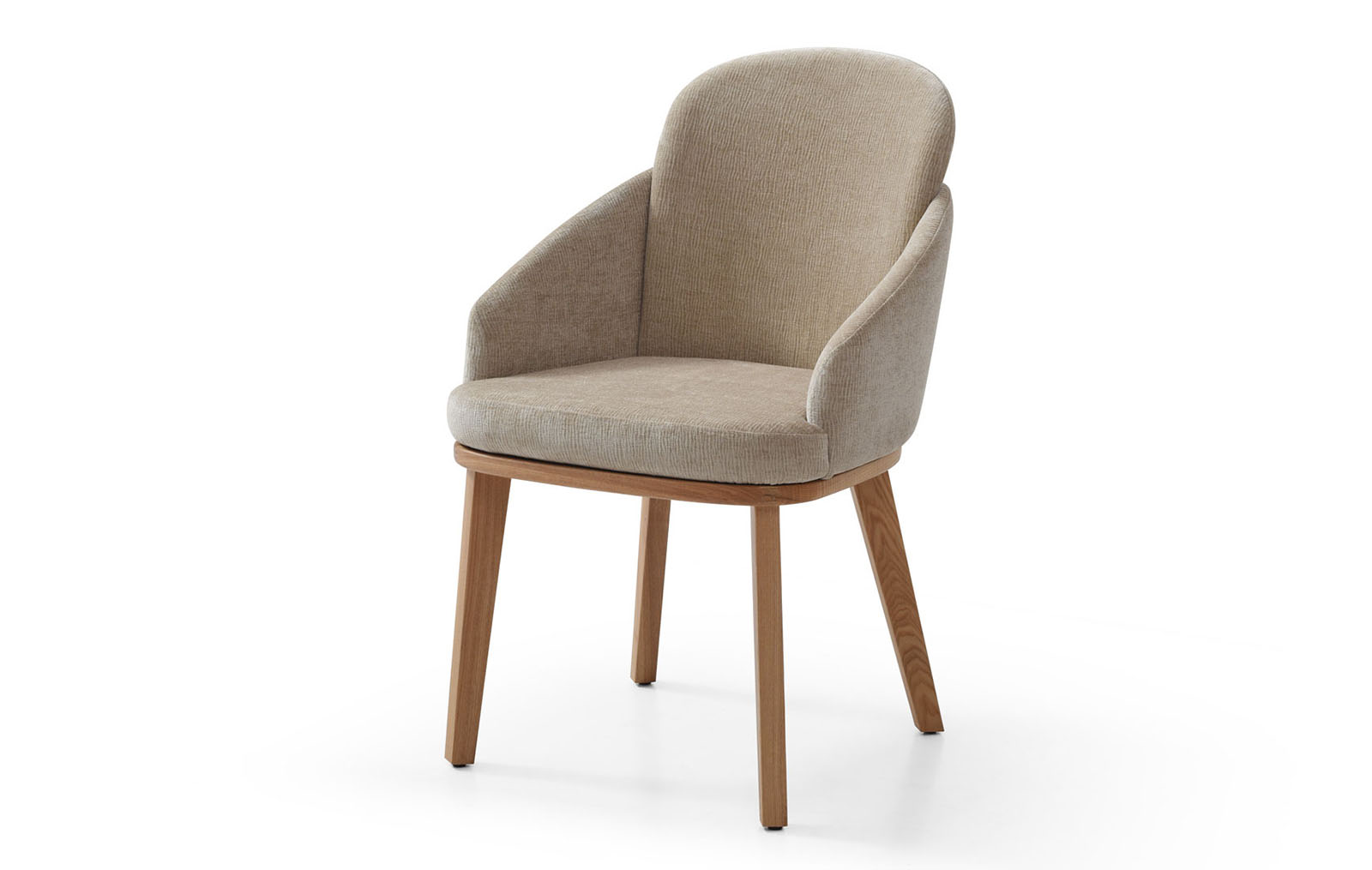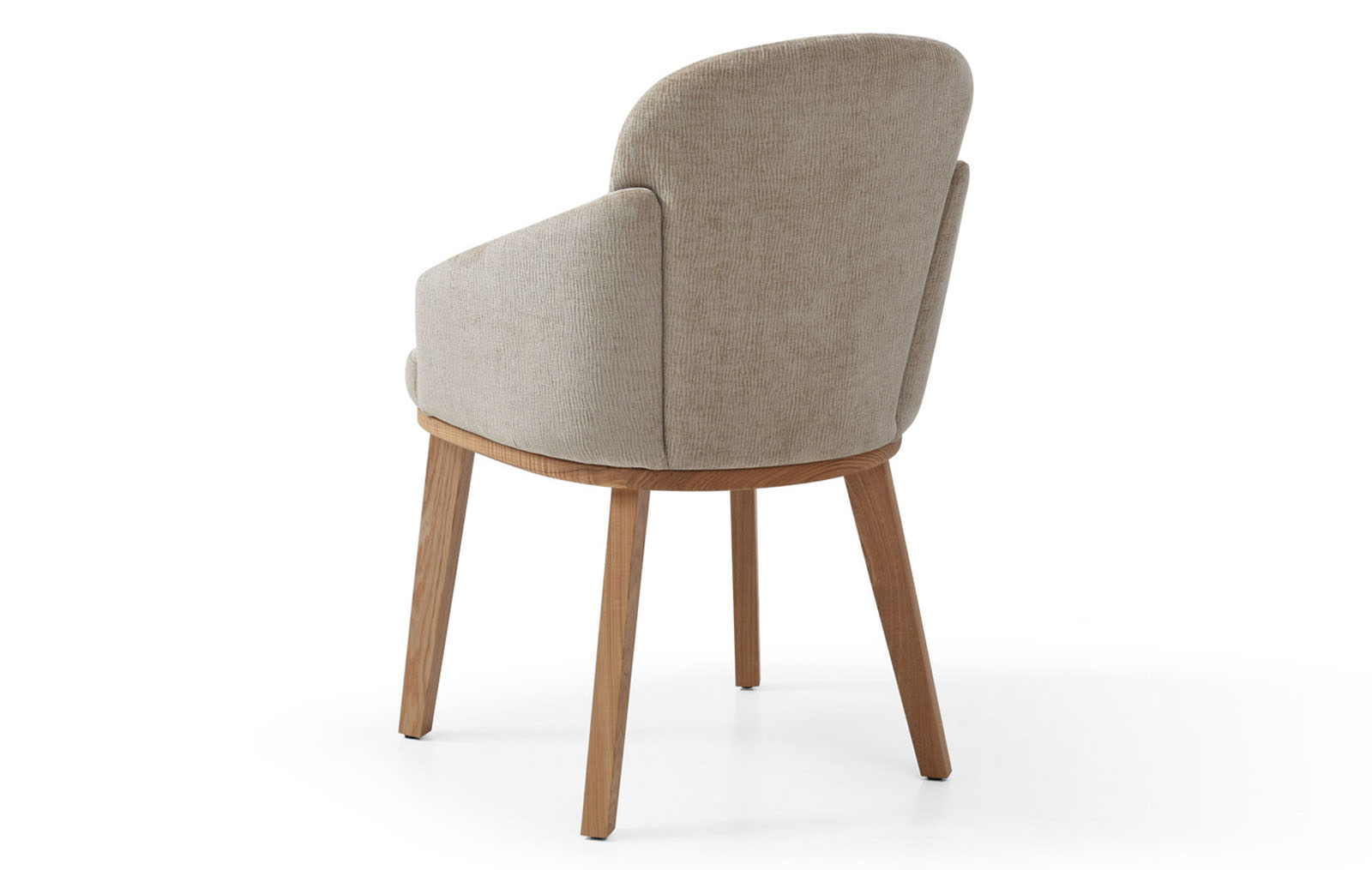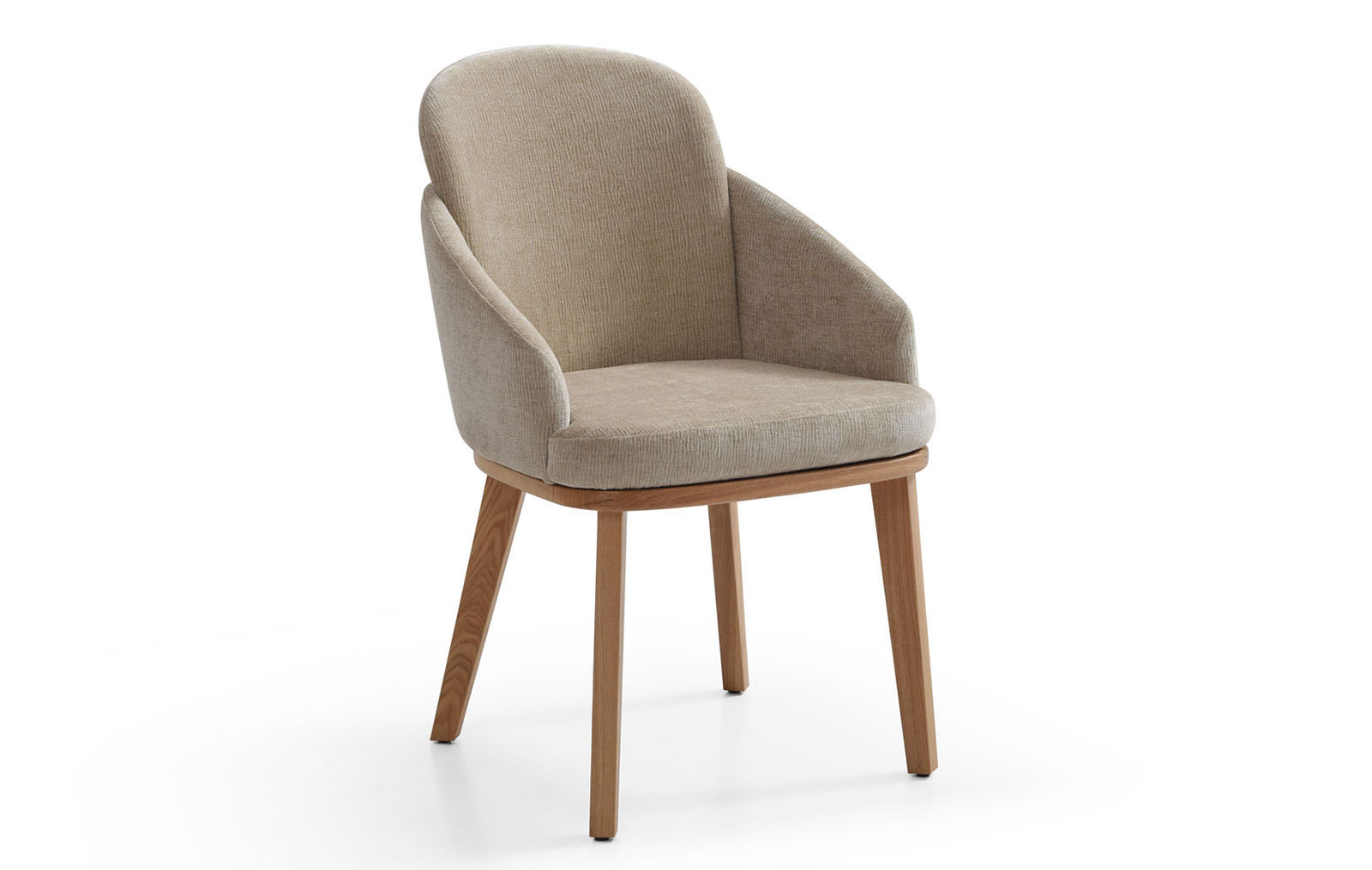 Обеденный стул Clarissa (Кларисса) имеет обивку из фактурной бежевой ткани и ножки из дерева, тонированные в оттенок ореха.