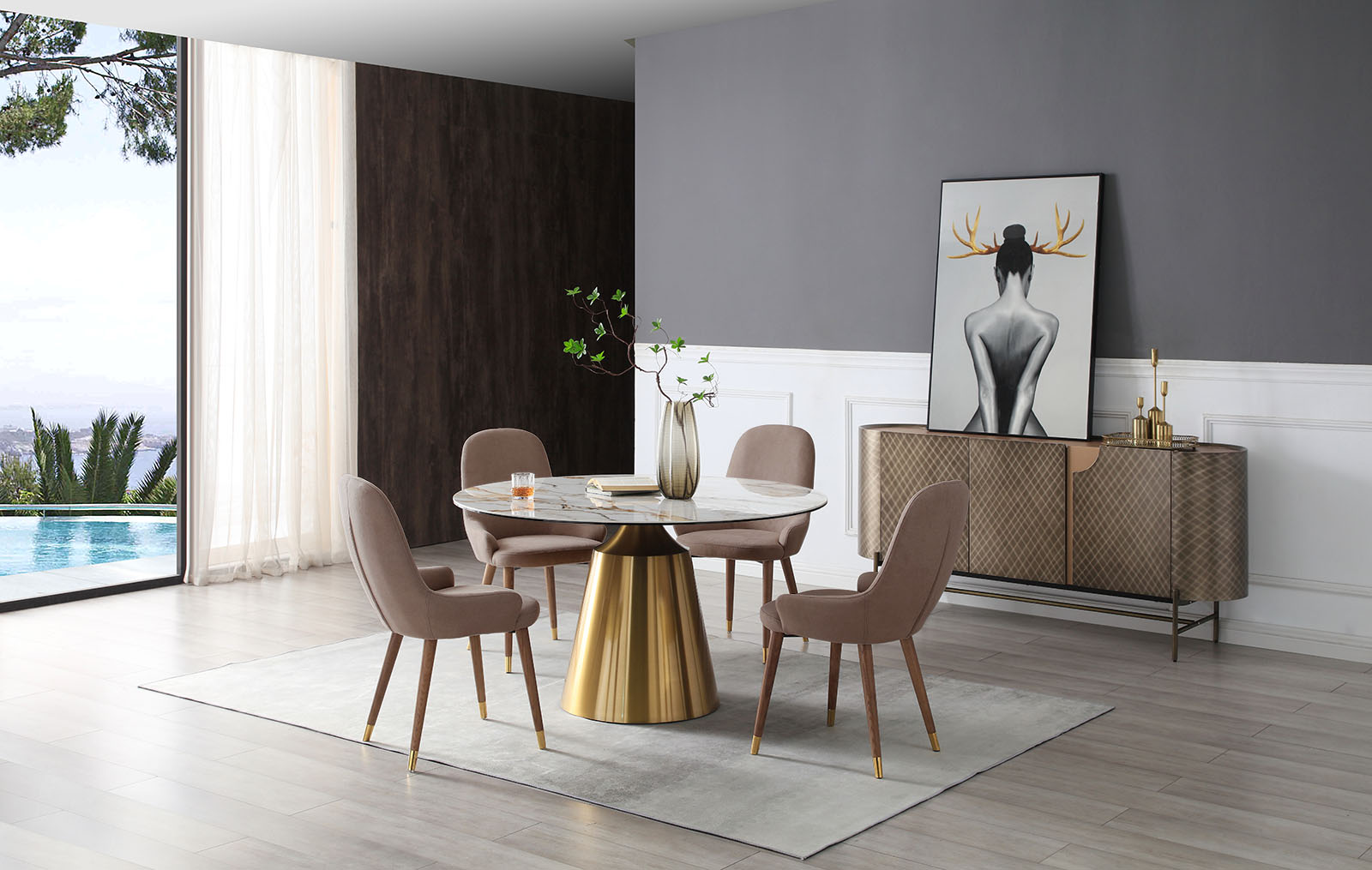 Ножки: Дерево, тонированное в оттенок ореха, нержавеющая сталь в золотом оттенке