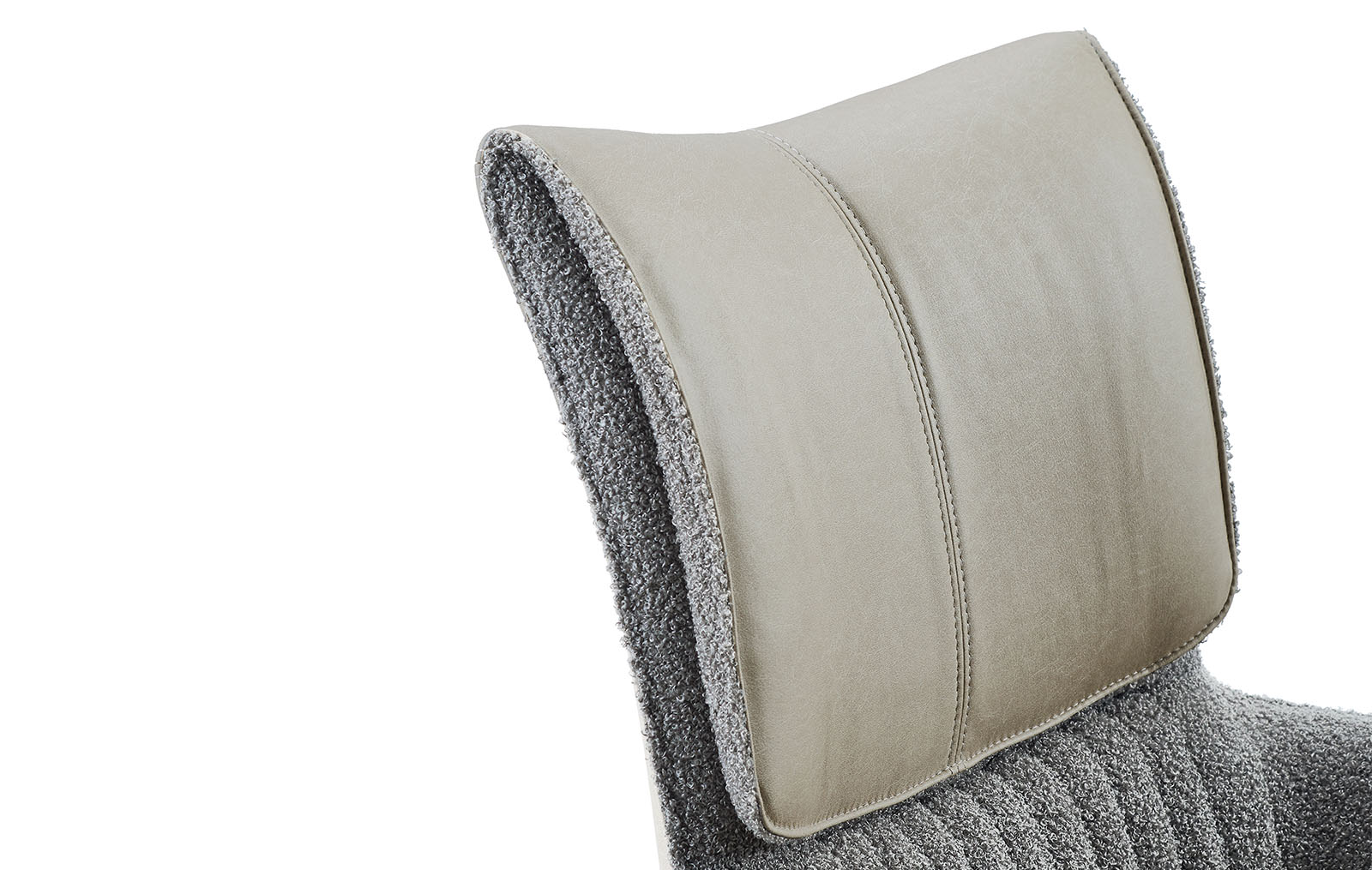 Обивка изготовлена из ткани тедди и экокожи серых оттенков.