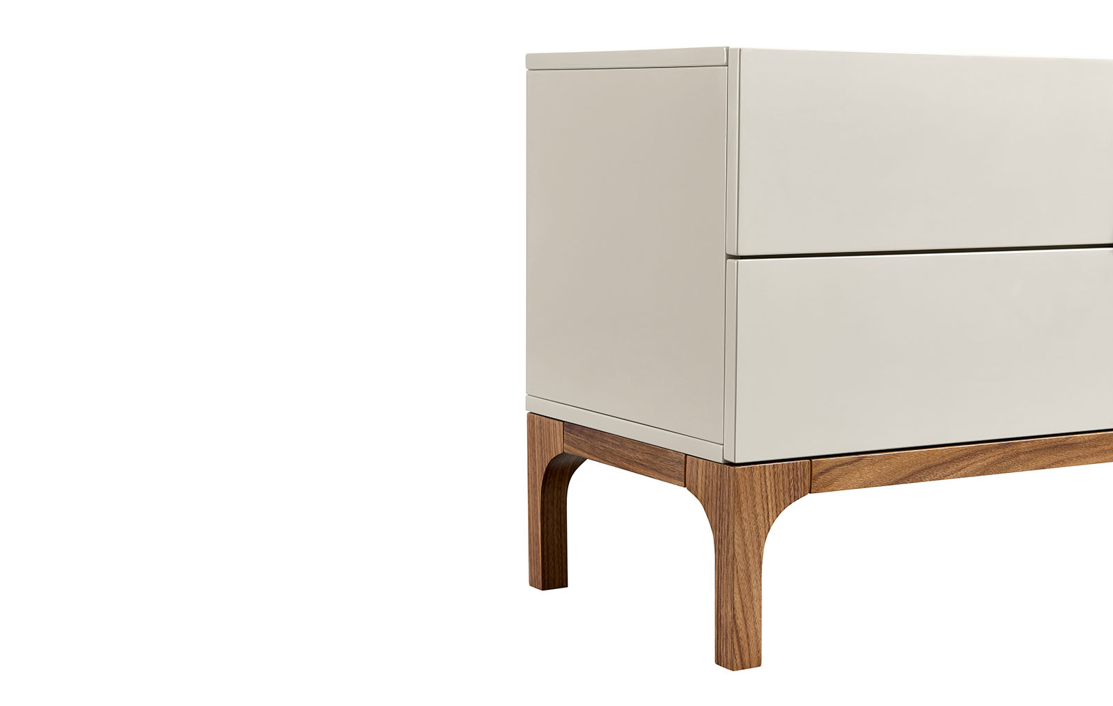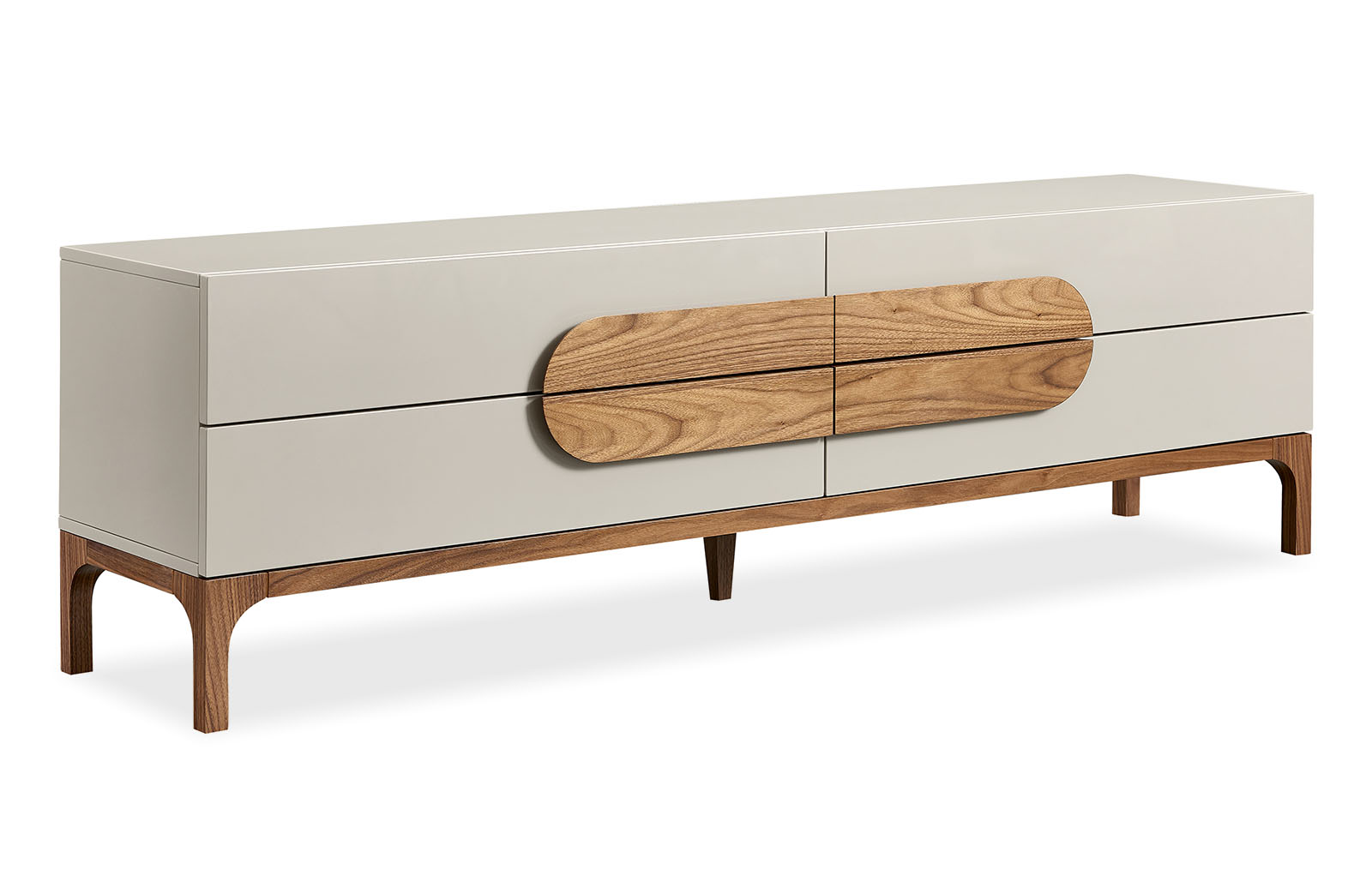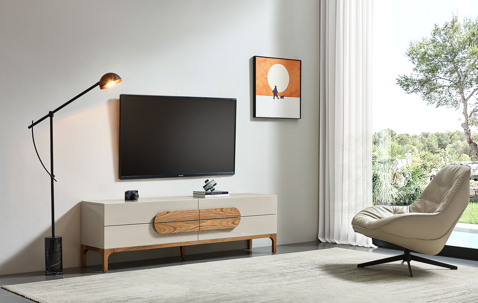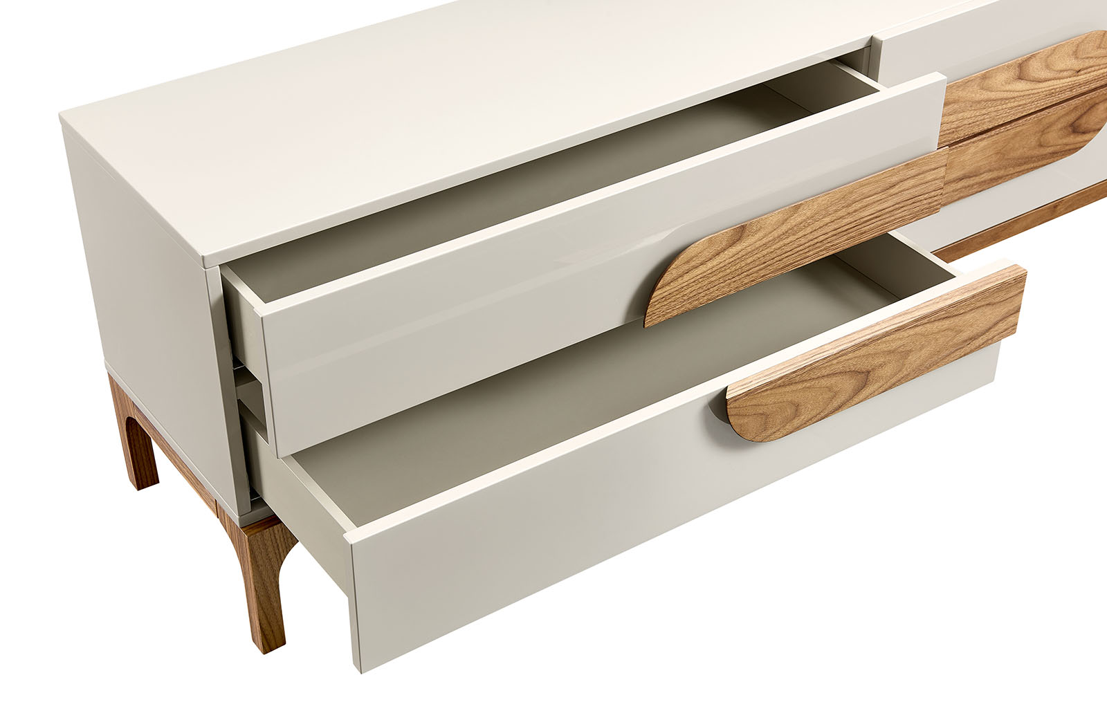 Тумба под телевизор Eloisa (Элоиза) благородного оттенка слоновой кости отлично подойдет для любой комнаты и будет гармонично смотреться в большинстве современных стилей интерьера. Сделана она из МДФ в глянцевом лаке, декорирована шпоном ореха.